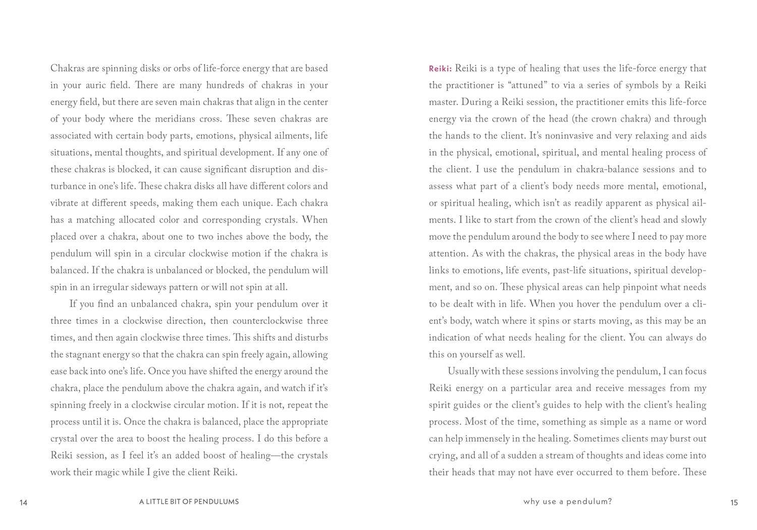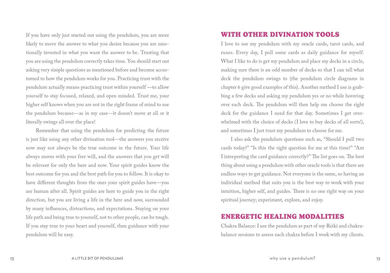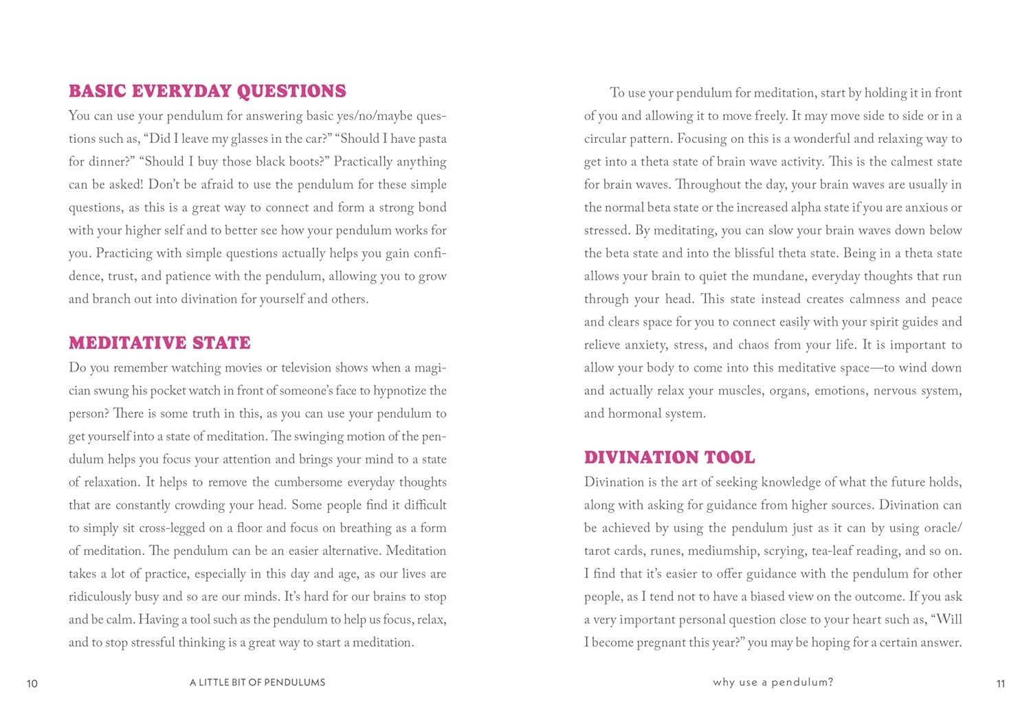 In the popular "Little Bit of" series: a fresh, accessible introduction to the practice of using pendulums. With every swing of the pendulum, you can develop your spiritual energy. Dani Bryant, a green witch, provides an easy-to-follow guide that explains how to choose or craft your pendulum, and use it for dowsing and divination. You'll find rituals for clearing negativity, balancing chakras, making contact with the spirit world, meditation, generating accurate answers to your questions, and much more. Hardcover Book with Printed Laminated Cover; 5 X 7 inches; 128 pages.