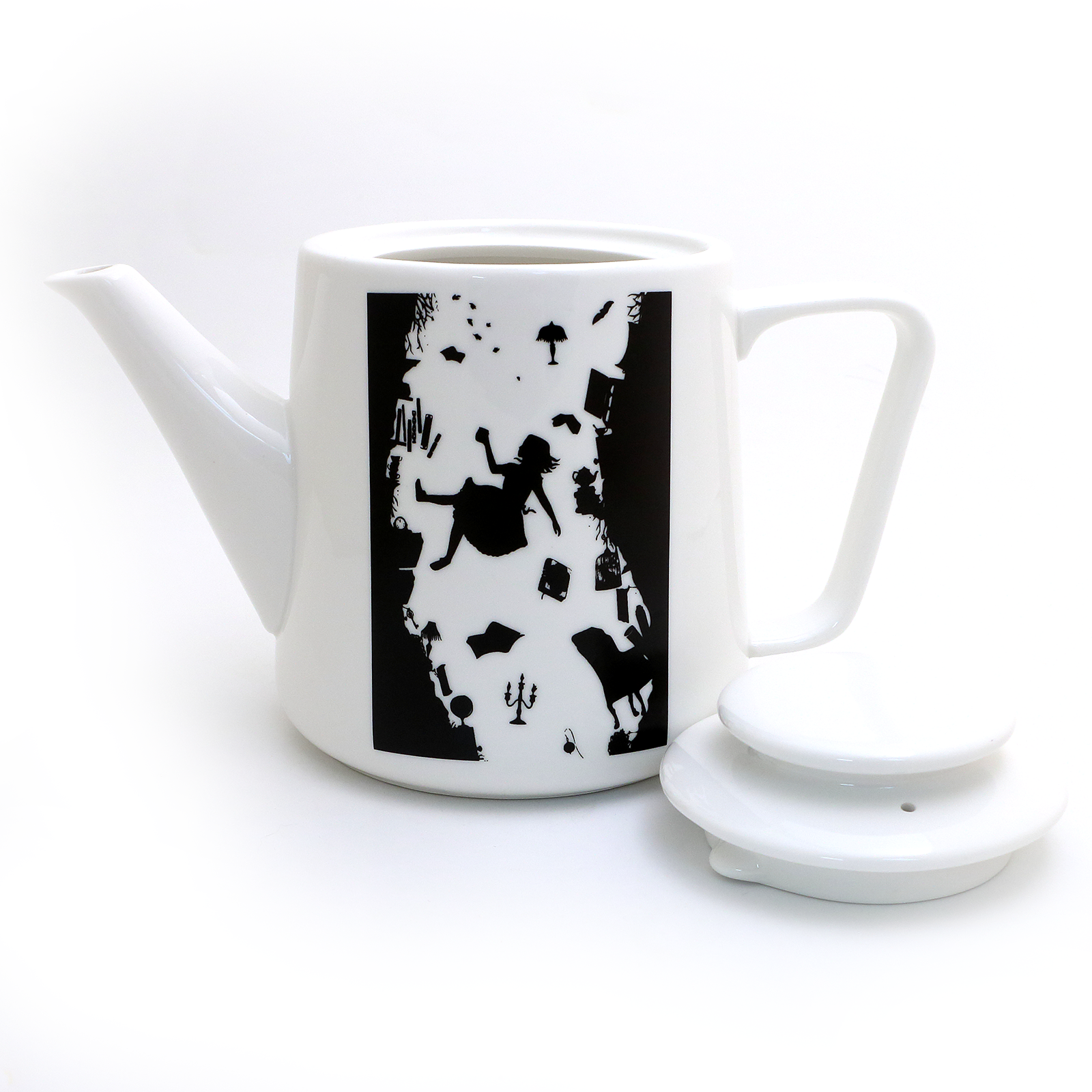 Alice in Wonderland teapot created from porcelain clay. Front features an image of Alice as she tumbles down the rabbit hole. The back features an image of Alice and the Cheshire Cat. This teapot is kiln fired to over 1900 degrees. All lead free, non toxic, eco-friendly materials were used. This teapot was made to serve and brew tea- please do not place on stove top or open flame. Safe to dish wash and microwave. It has an interior strainer created by piercings in the wall before the spout, so can be used with loose tea leaves. Lid has lock feature for extra safety when pouring. This large teapot measures 6 inches high by x 9 inches spout to handle- Holds 4-5 cups. 32 oz. Great gift for an entertainment buff or lover of tea.