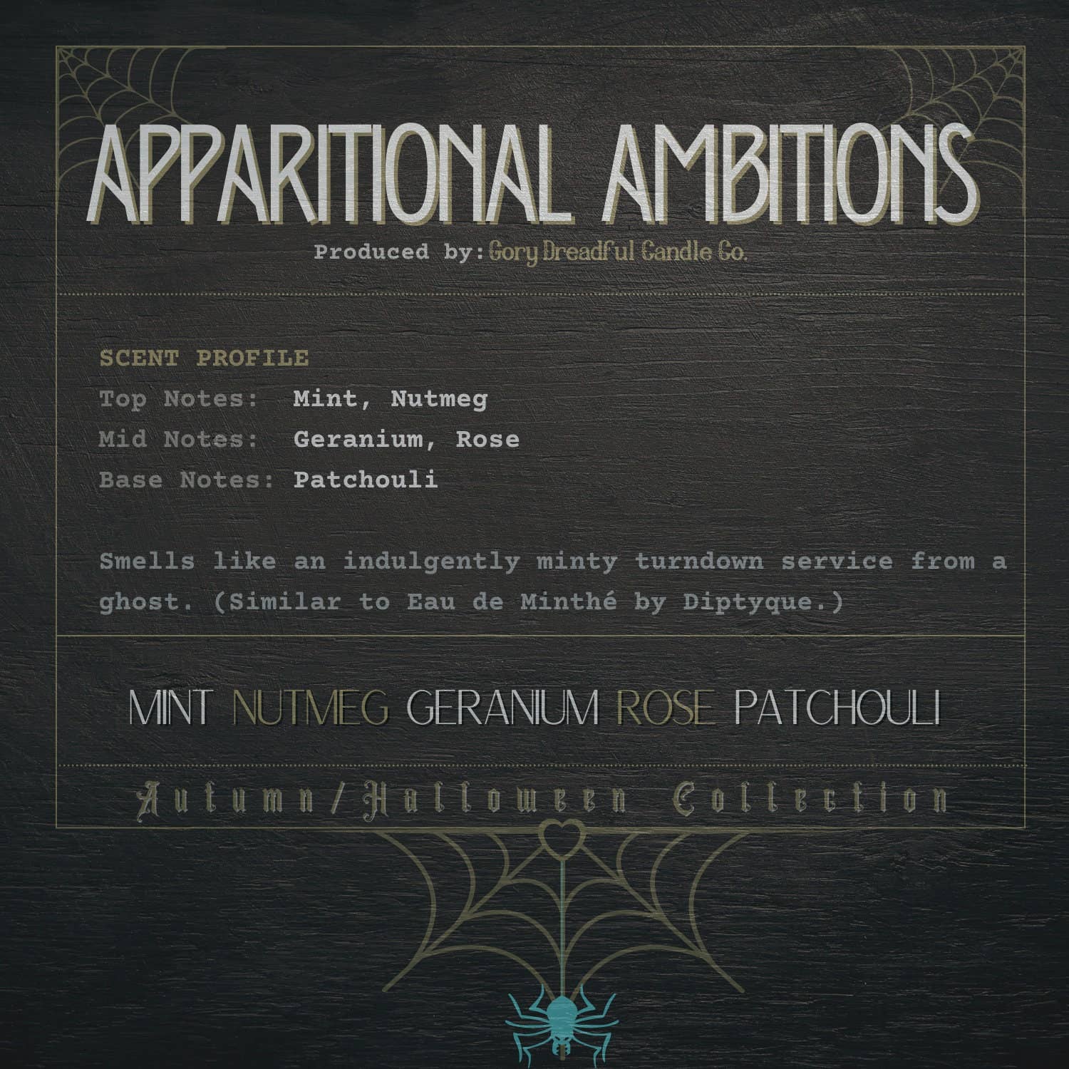 Apparitional Ambitions is a unique blend of mint, nutmeg, geranium, rose, and patchouli that will transport you to a world of inspiration and invigoration.