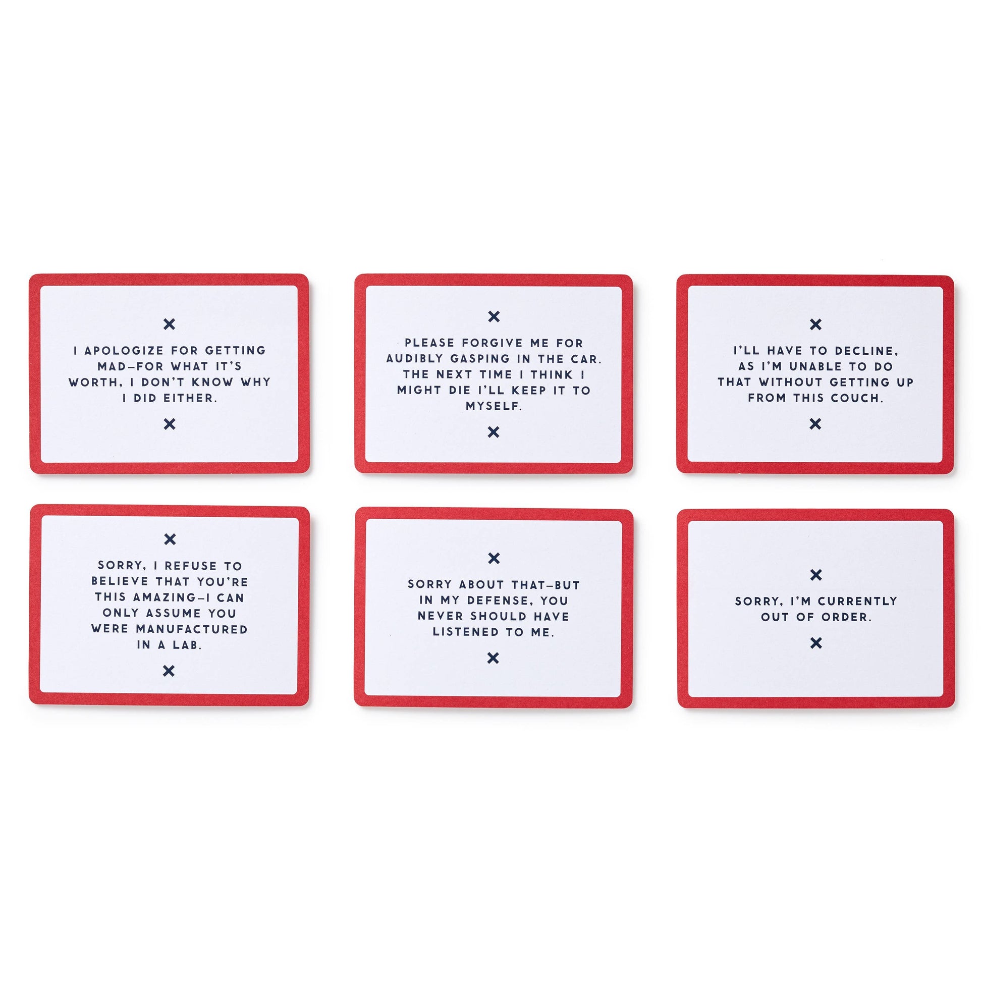 • Includes 100 double-sided cards–with each featuring a unique apology on the front.