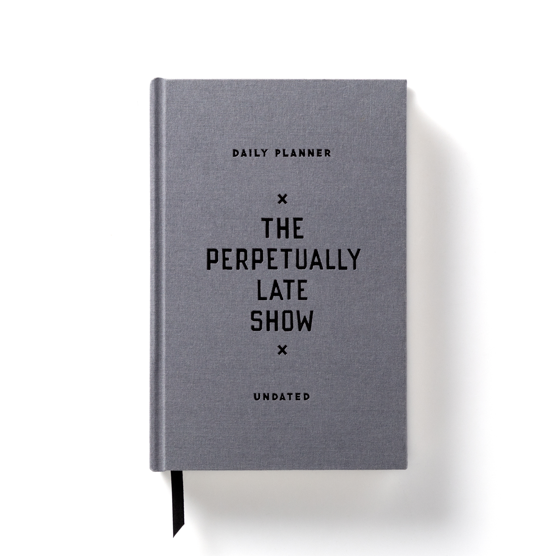 • Features a cloth-bound cover with embossed 'The Perpetually Late Show' artwork.