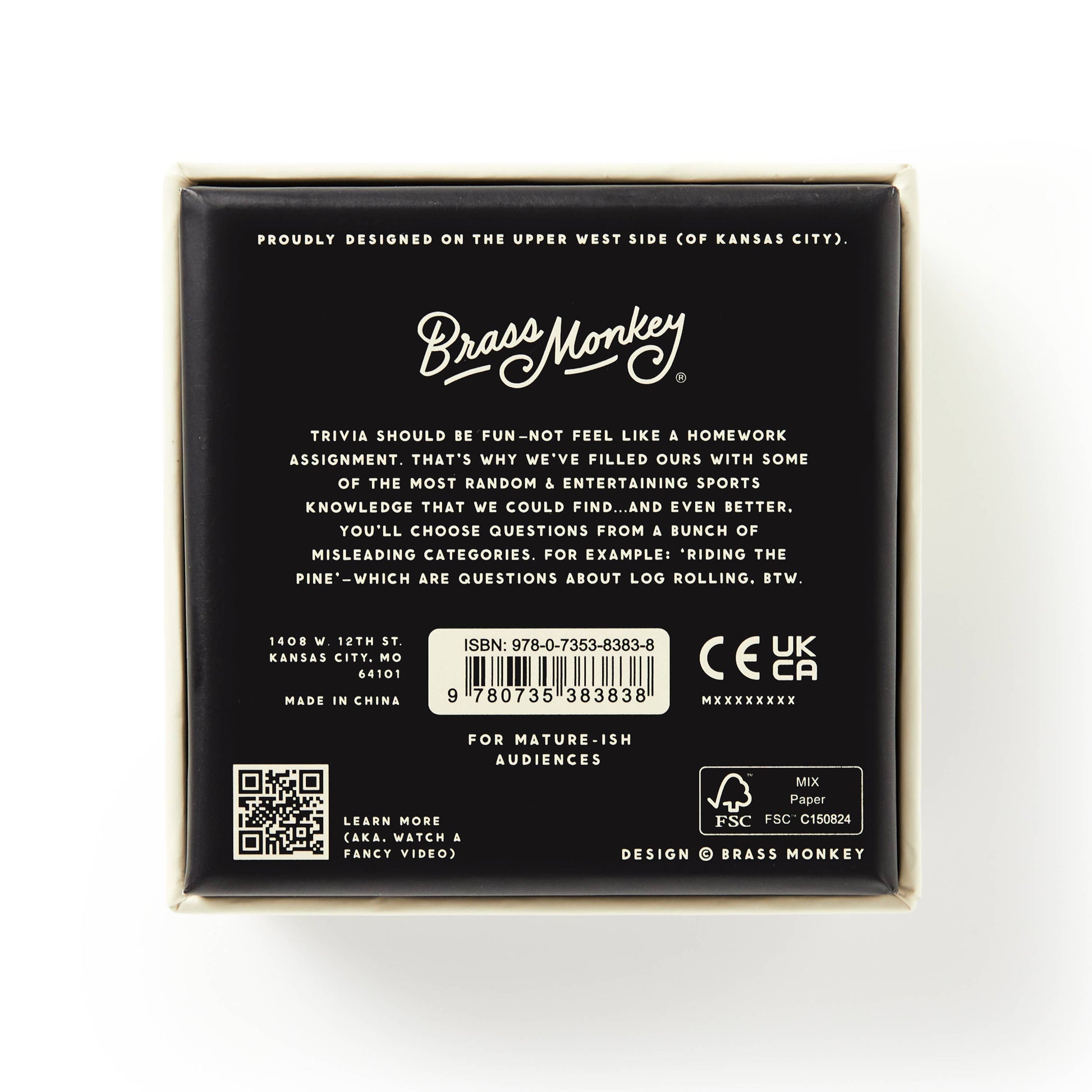 * TRIVIA - The Weird Sports Trivia from Brass Monkey has the quirkiest facts and anecdotes from the wide world of athletics. From obscure sports origins to bizarre records, each trivia card will have even the most professional sports enthusiasts questioning their athletic history. We think trivia should be fun and not feel like a homework assignment. That’s why we’ve filled ours with as many weird and obscure sports facts as we could find…and even better, you’ll choose questions from a bunch of misleading categories. For example: “Riding the Pine” - which are questions about log rolling.