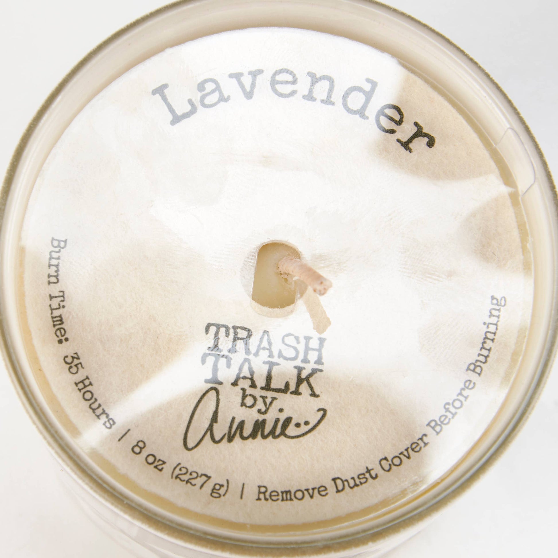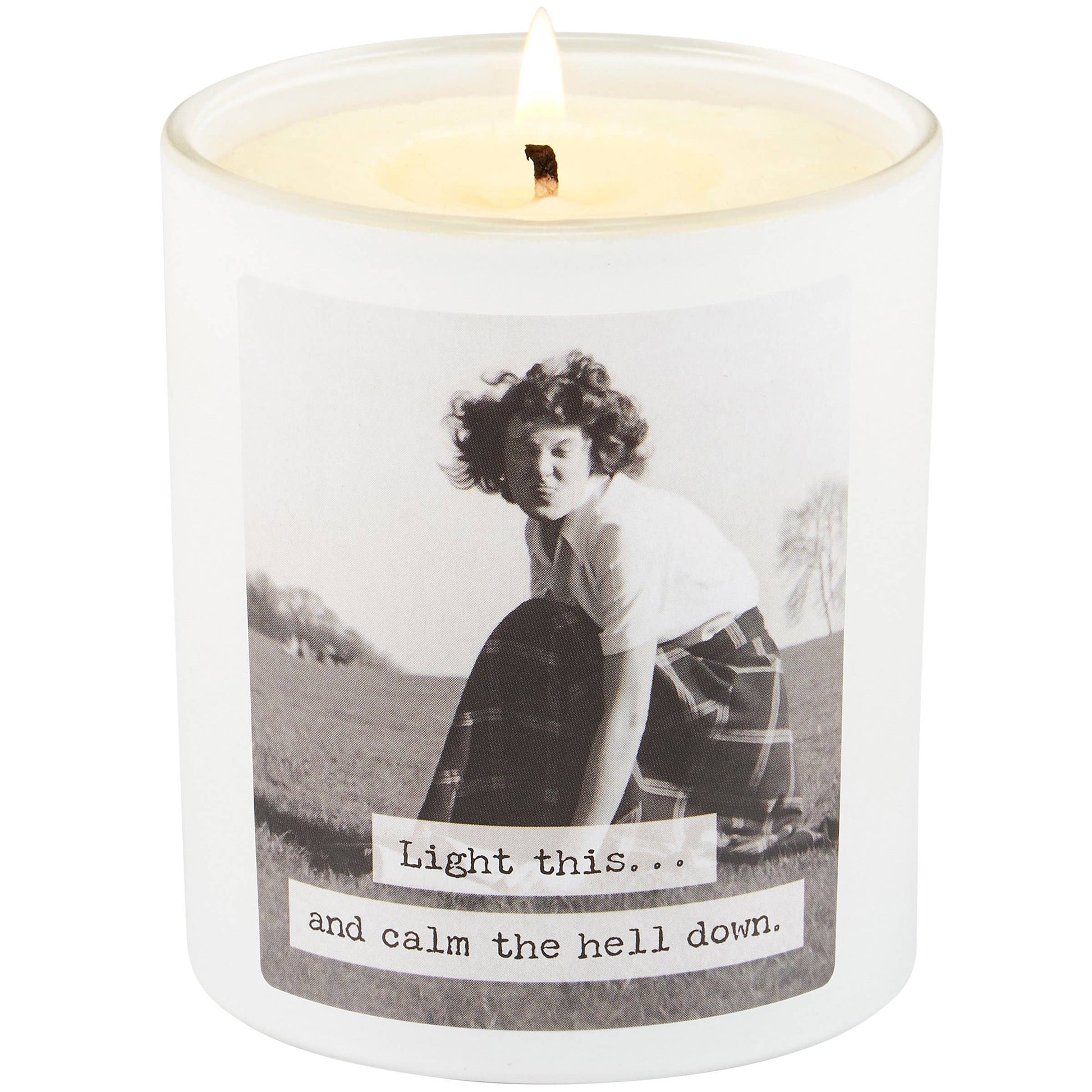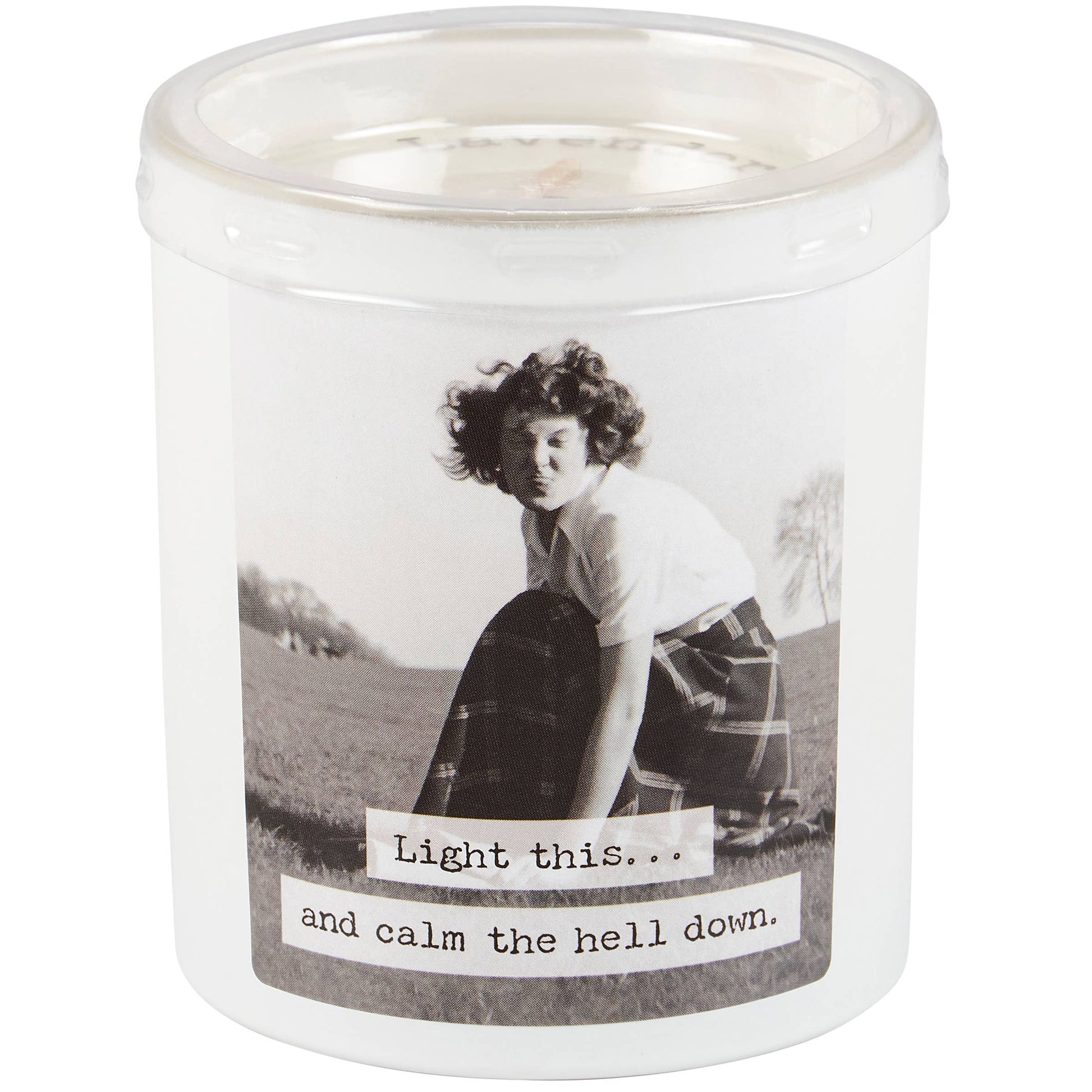 A jar candle from our Trash Talk By Annie Collection displaying a double-sided design of a vintage black and white photograph on frosted white glass complemented with a humorous sentiment that reads "Light This... And Calm The Hell Down." Candle features soy-based wax and cotton wick with 35 hours of burn time activating a calming Lavender scent. Our Calm Down jar candle includes a dust cover and plastic lid for protection and polished appearance. A hilarious home accent that is great for everyday gifting.
