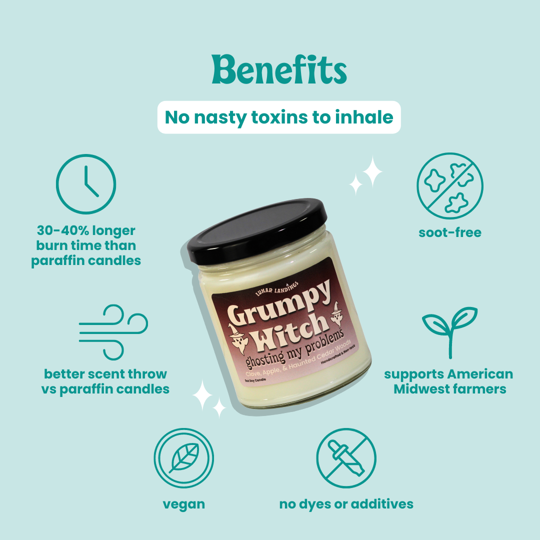 Relax in solitude with our blend of autumn spices, apples, and haunted woodsy musk. You’re a Grumpy Witch and Casper will love lighting this candle with you. Because, let's be real, Casper is your favorite company. 👻 Our spooky candles deliver clean- burning and cozy aromas, with a wicked “scents” of humor.
