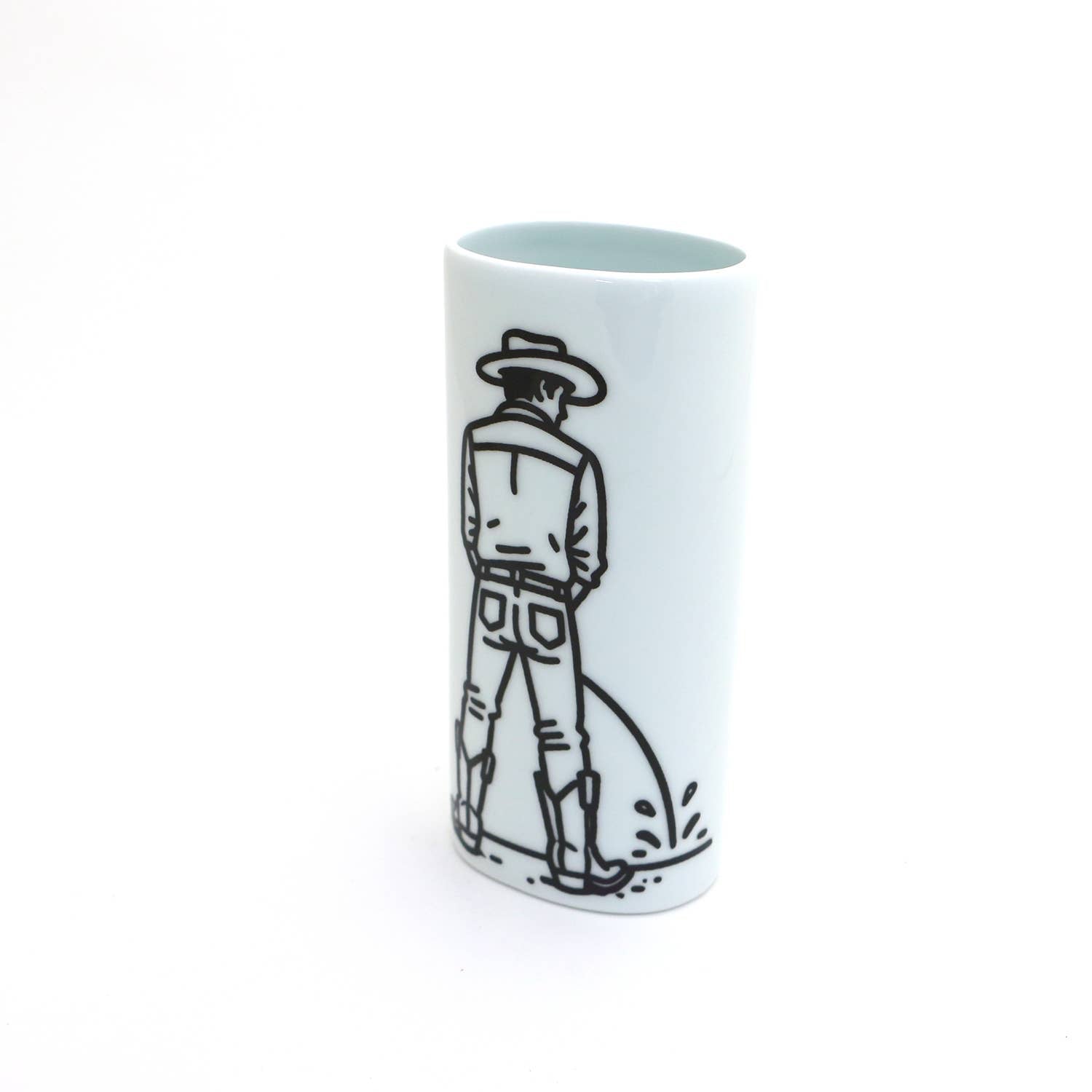 Handmade porcelain bud vase features a cowboy doing his own version of watering the plants. Measures 6 inches high, oval shaped. Opening is 2 x 3. FLOWERS NOT INCLUDED- PHOTO PROP ONLY. Ships immediately. Funny gift.