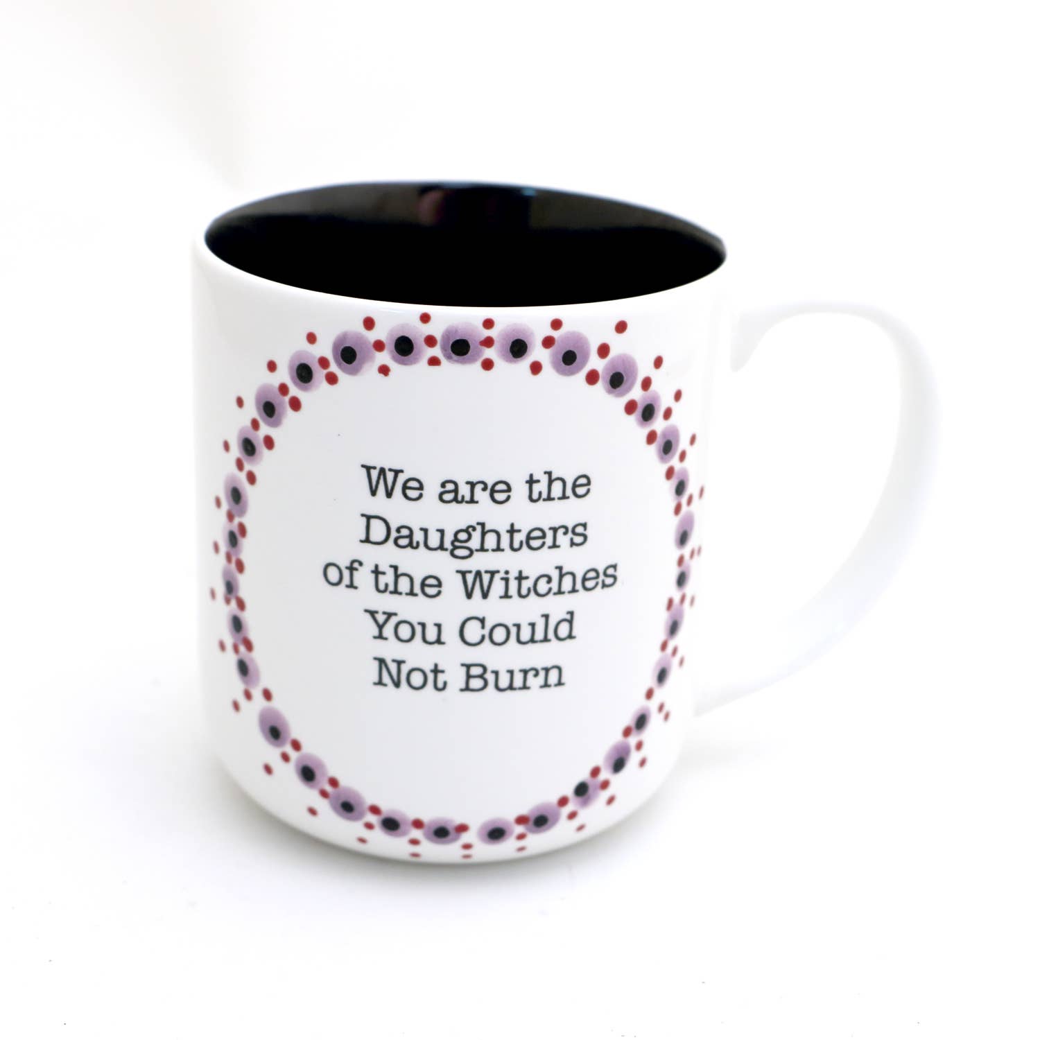 Perfect mug to enjoy a brew of any kind. Reads: We are the daughters of the witches you could not burn. Outside glazed a glossy white, Interior is black as a cat on the back of a broomstick. Back is plain. Handmade from stoneware clay, this mug measures 4 x 4 and holds 16 oz. Created with all lead free, non toxic materials- safe to place in the dishwasher and microwave. Made to be used and enjoyed.