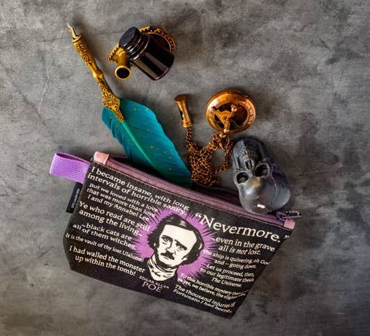 On both sides there’s a dashing portrait of Edgar Allan Poe surrounded by a dozen quotes from his life and works This sturdy canvas pouch is the perfect place to stash that which you cannot lose – your crow quill pen, a bottle of ink. Perfect for Halloween goodies. Our zipper bag is a 5"x9" fully-lined pouch with an inner card pocket and a 2" gusset -- so it stands at the ready!Timeless Keepsakes~ Trendy Kitsch~ We Have It All