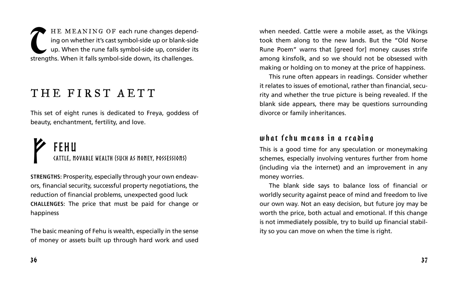 Developed thousands of years ago, the runic alphabet has long been a way to tap into the currents of fate. With Essential Runes Kit, learn everything from the history of runes to their meanings, as well as practical advice on divination using both casting and layouts. Everything necessary to begin this fascinating practice is included: a cloth for rune casting, a full set of twenty-five wooden runes, and a guidebook. All you need do to receive the most accurate readings it to simply ask a question, throw the wooden runes into the circle printed on the cloth, and then refer to the guidebook to interpret their meanings. In-depth definitions of each of the twenty-five wooden runes included in this kit—including the blank "Odin's Rune"—help develop mastery, as well as suggestions for techniques that include casting up to nine runes at a time to answer complex questions. Kit; 5 X 6 1/2 inches; 80 pages.