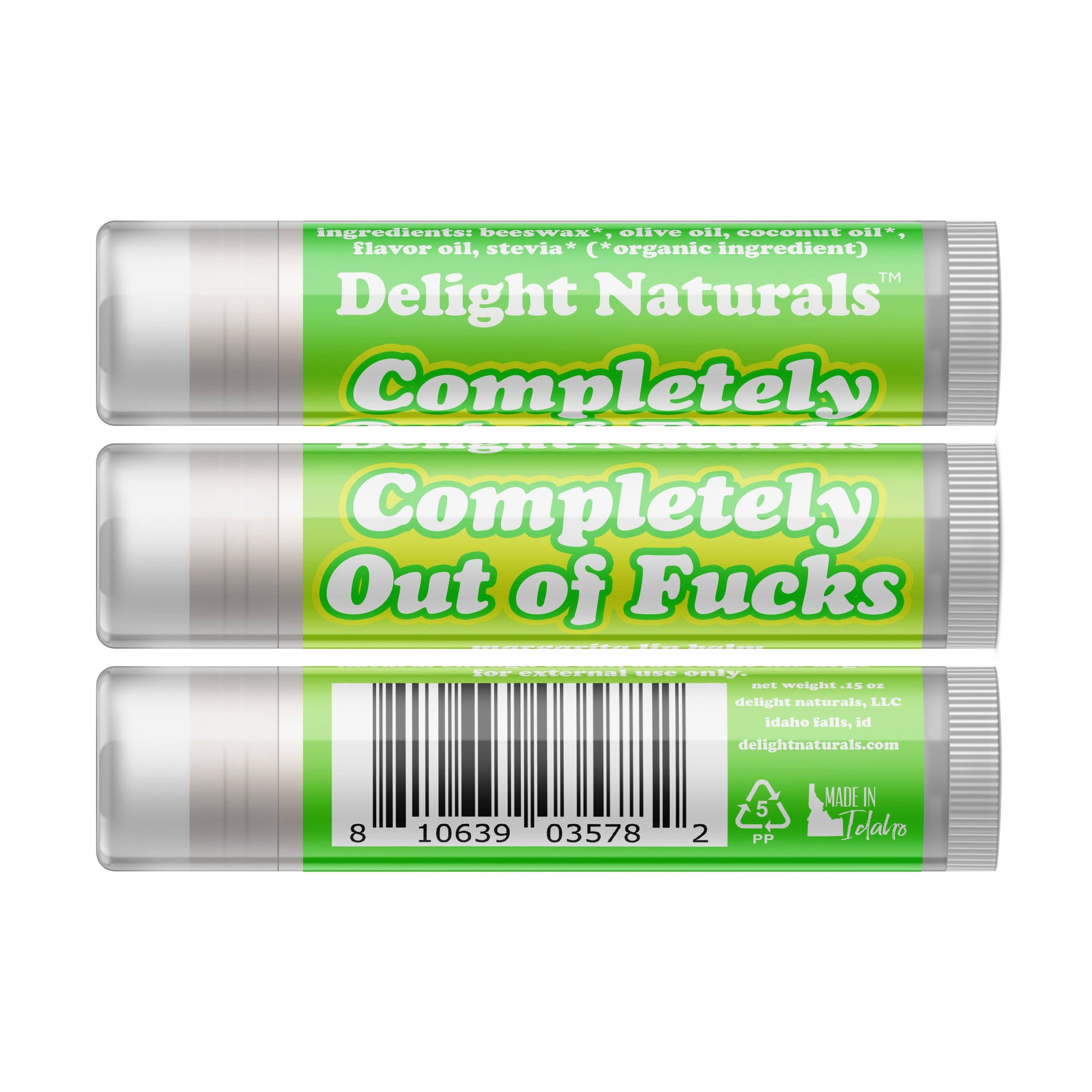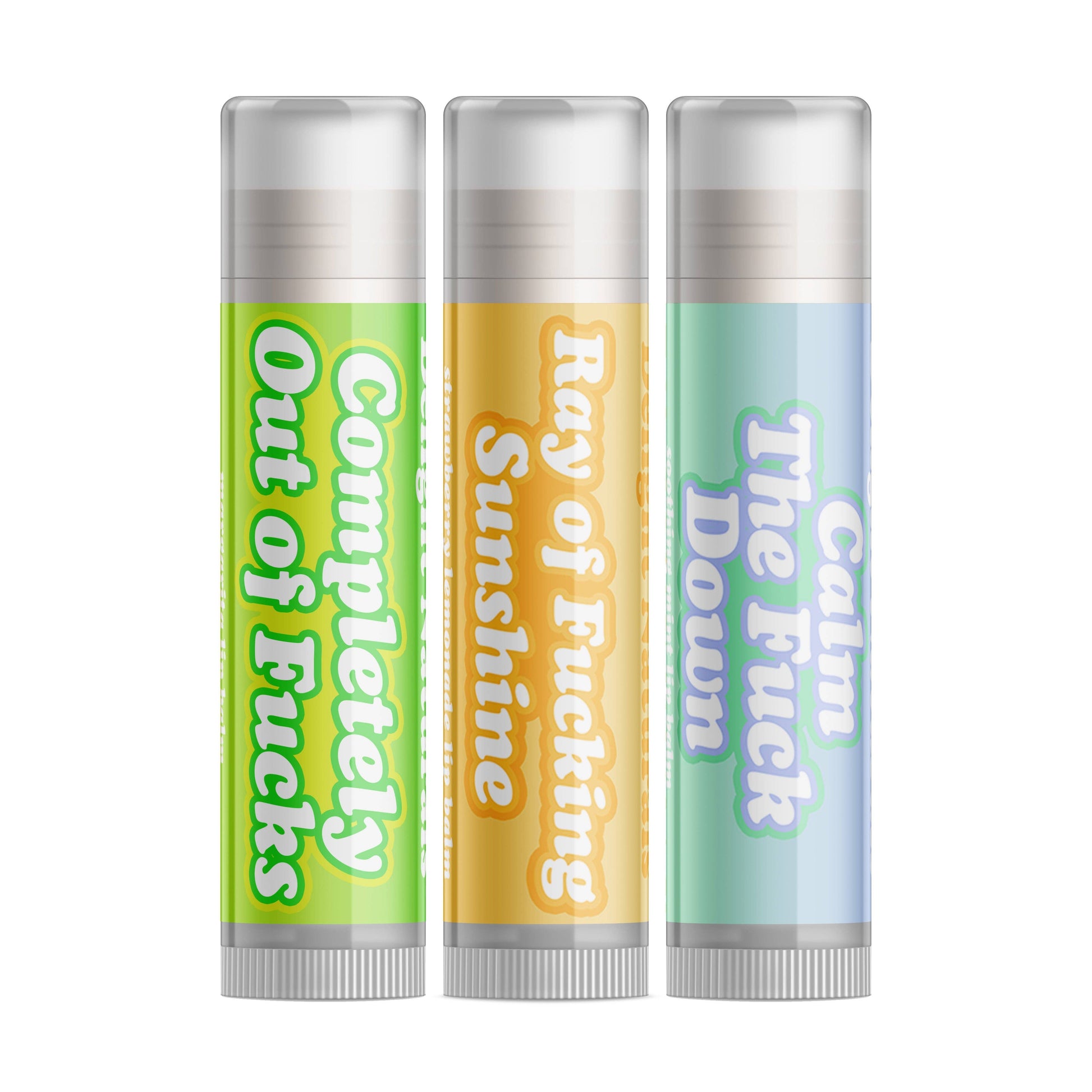 Set includes: Completely Out of Fucks (Margarita Flavored), Ray of Fucking Sunshine (Strawberry Lemonade Flavored), Calm the Fuck Down (Soothing Mint Flavored).
