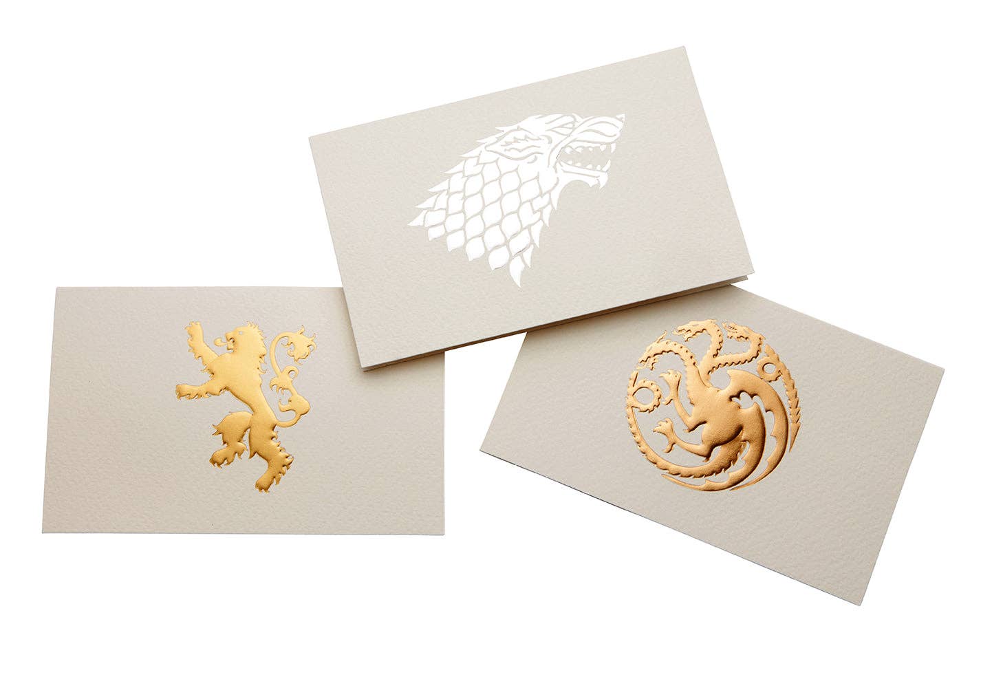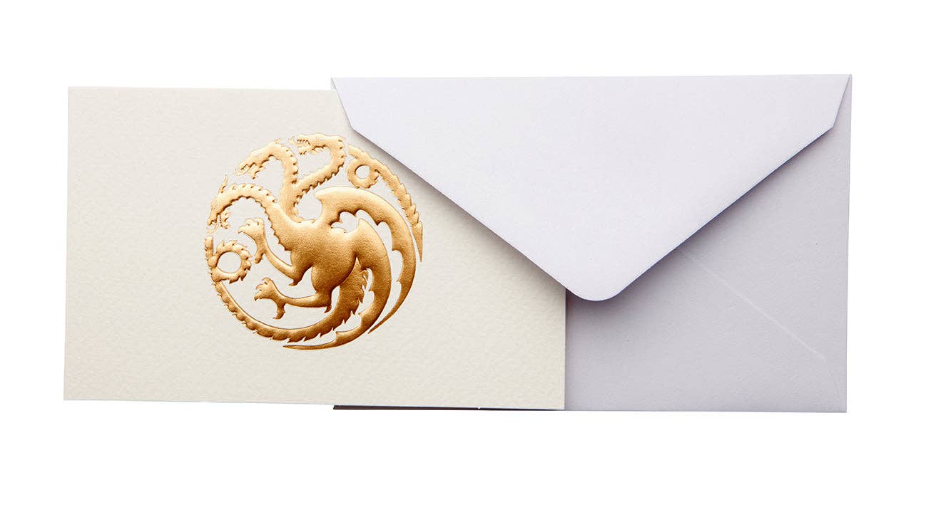 Send a message from Westeros with these classic Game of Thrones note cards featuring the iconic sigils of three of the most powerful families in the Seven Kingdoms: Stark, Lannister, and Targaryen. Showcasing a sophisticated, minimalist design printed on high-quality paper, this embossed foil note card set includes 12 blank cards and 12 envelopes.
