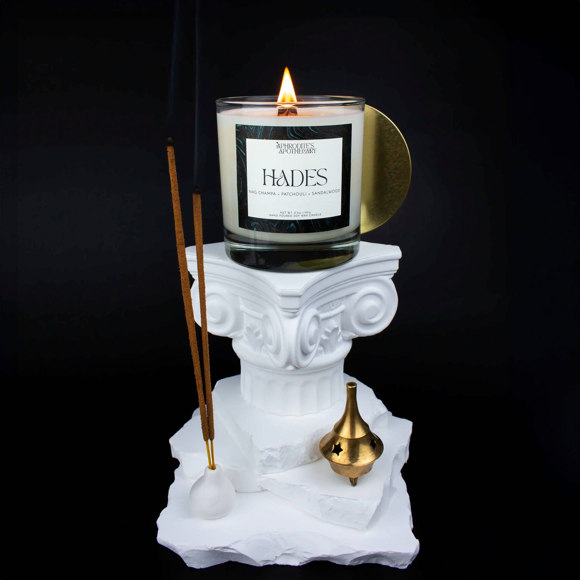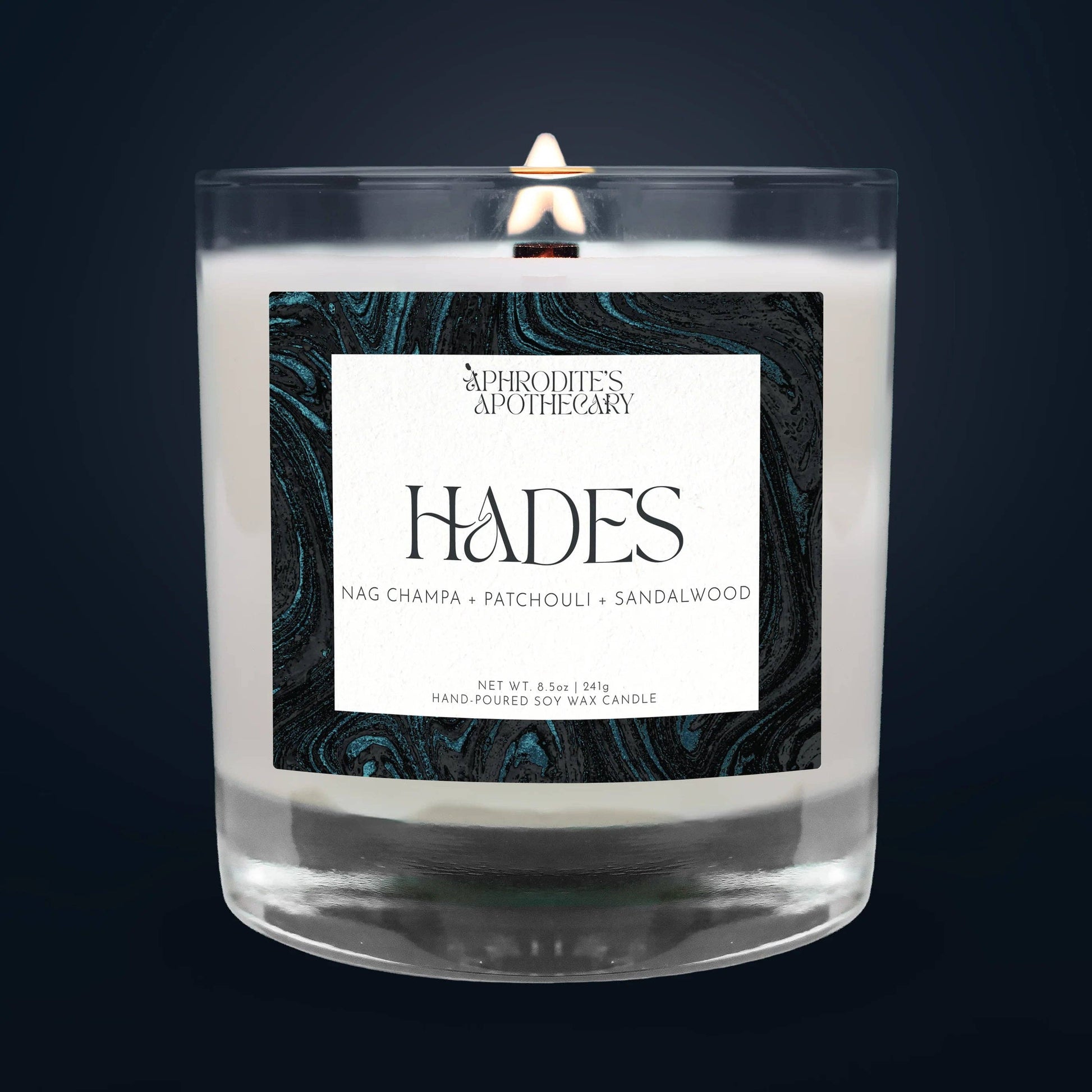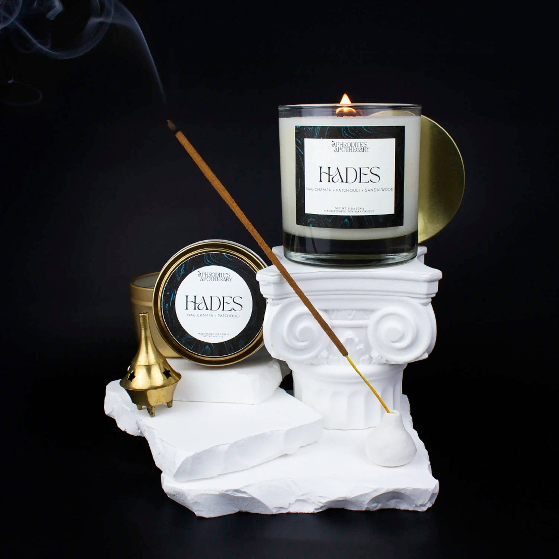 Slip into the shadows with our best-selling Hades Candle, a grounding fragrance of woods and incense fit for the underworld. Hades is a smoldering blend of bergamot, faint whispers of delicate florals, sitting atop a dry bed of patchouli, sandalwood, and musk - evoking the nostalgia of a '80s new age store or incense wafting from a church altar. Hades is the god of death and the Underworld, and, contrary to popular belief, he wasn't a bad guy -- just misunderstood (no, really)! Hades isn't even the god of death (that is Thanatos), he only rules over them!