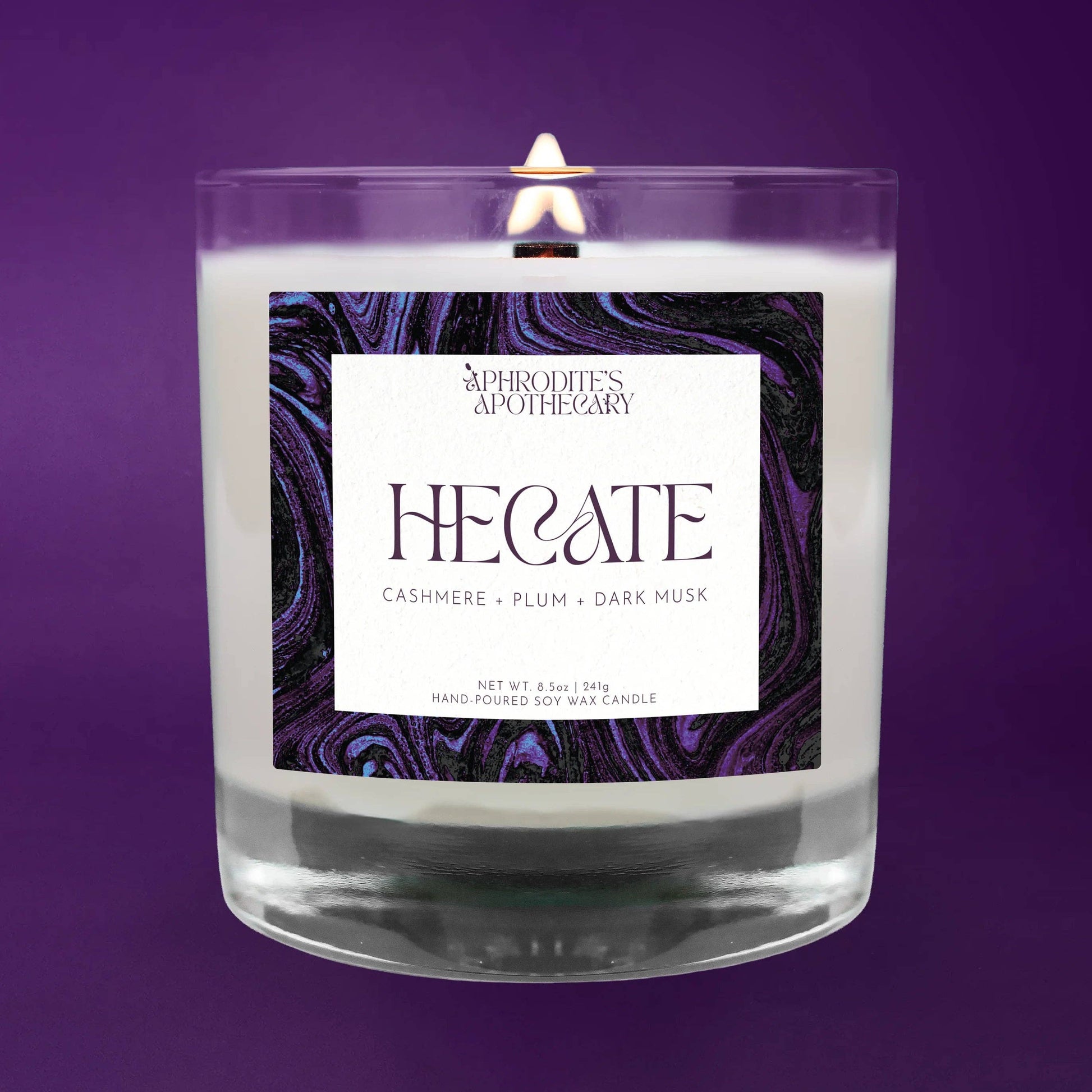 Like the twin torches she bears, our Hecate Candle weaves a dark spell of mystery with every flicker. This Hecate candle boasts fragrance notes of juicy plum, cashmere, and dark musk that will enthrall your senses and leave you spellbound. Hecate (or Hekate) is the goddess of many things (open the "Who is Hecate?" tab above to learn more!) but is most well-known for her connection to magic and sorcery. Burn our Hecate candle to fill your room with its lush, decadent scent or use as an altar candle to aid in your own magic rituals.