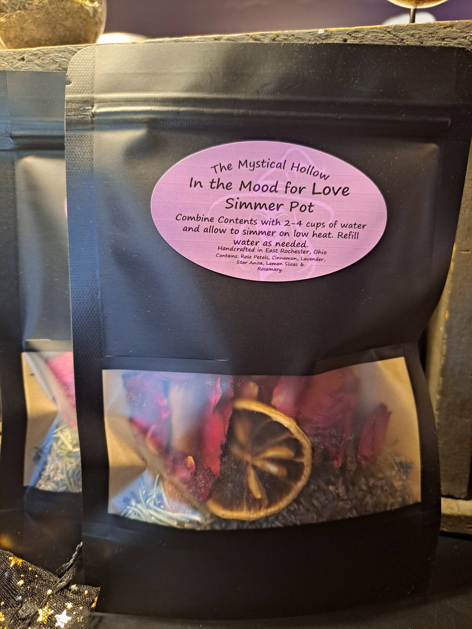 Enhance your space with In the Mood for Love Simmer Pot. Each kit is handcrafted with the perfect blend of Herbs and Spices to Create Romance and Love. Each kit includes an Essential Oil Vial of Vanilla for a Stronger Aroma.