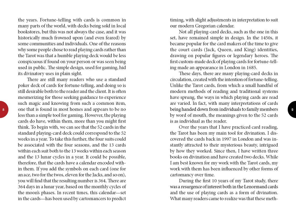 Much has been written about reading with playing cards, and many systems have been shared, but these methods have not always been easy to learn or remember. This 52-card deck changes that with a set of fully illustrated cards that show recognizable symbols with keywords that allow the diviner to read them right out of the box. The cards have been designed to provide the reader with a comprehensive oracle system for our modern age. While the illustrations have an antique and mystical feel to them, the subjects covered by the 52 cards are relatable to our daily lives and will stand the test of time. The accompanying guidebook offers thorough working interpretations and shows ways in which the cards can be read in sequence and spreads. Examples are also provided to show how the cards relate to real-life scenarios, making for a deck that is truly accessible, easy to use, and accurate.