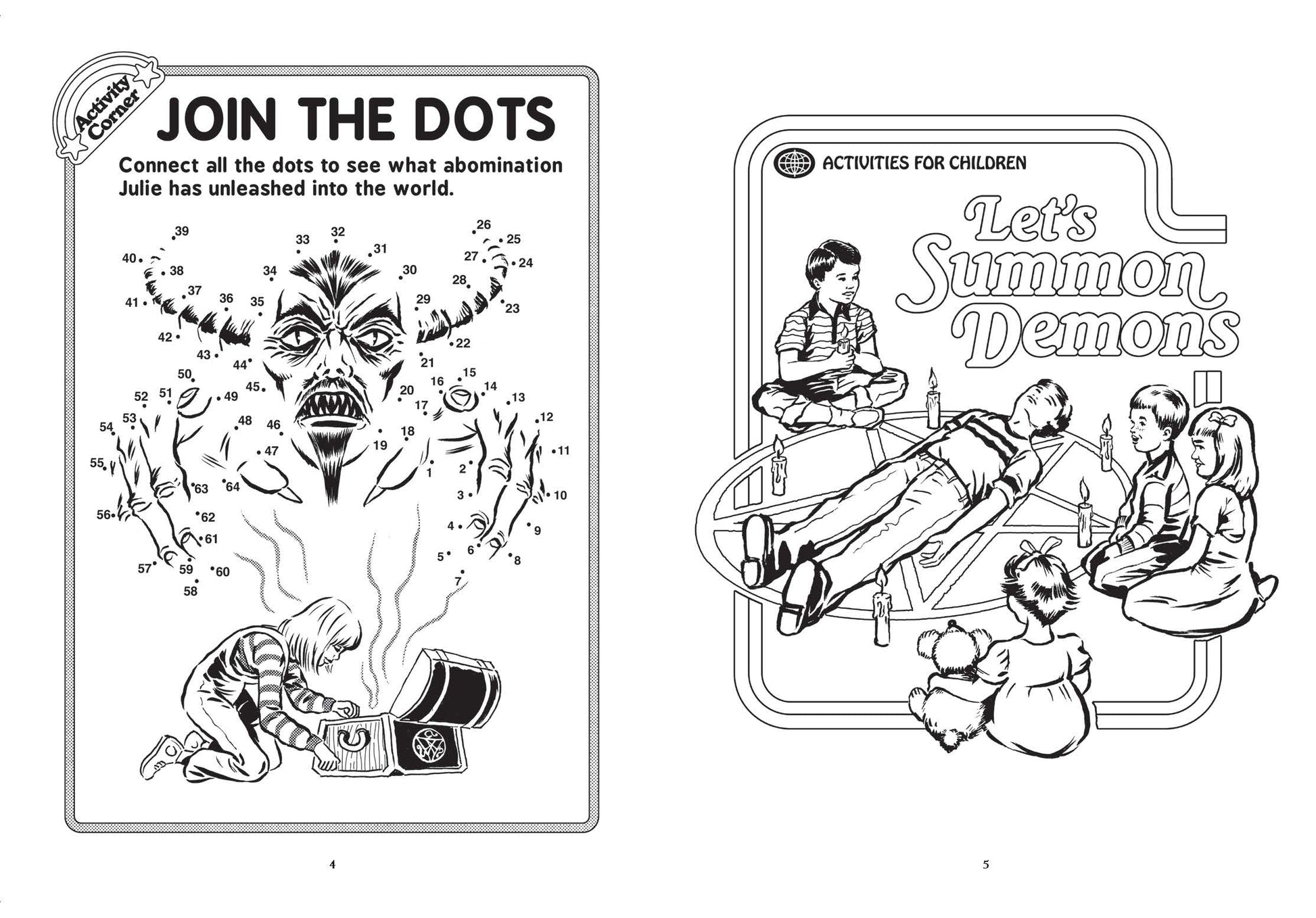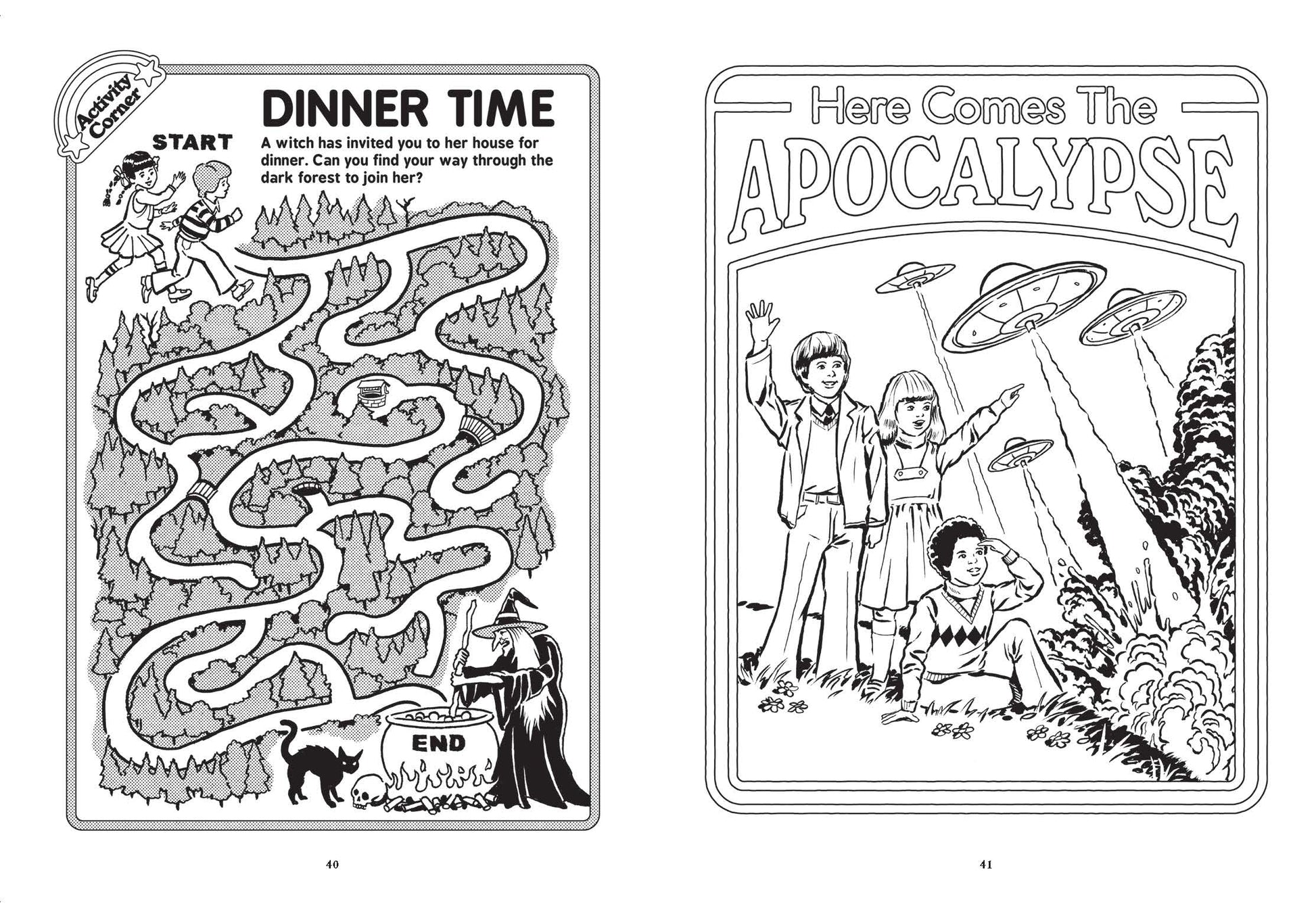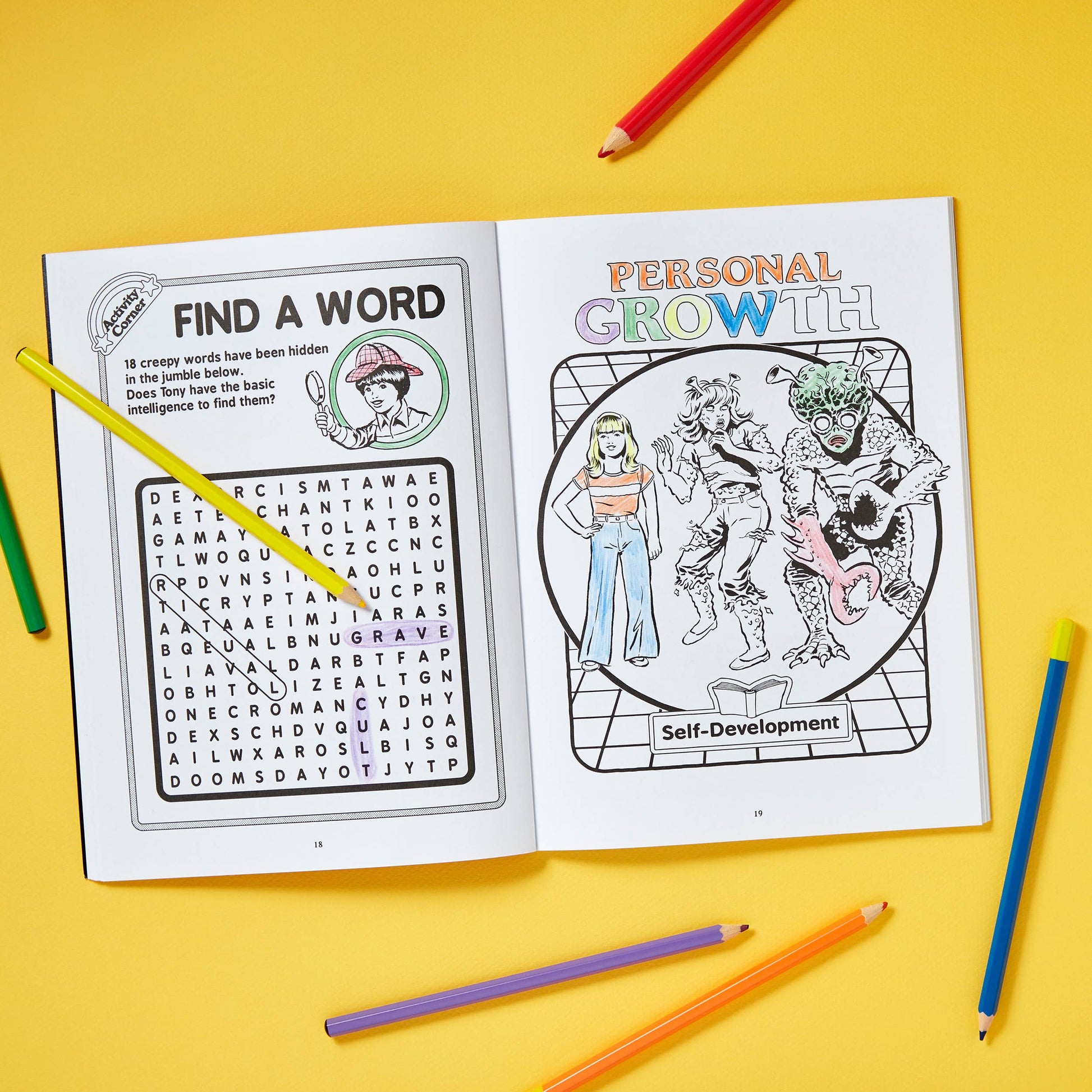 Unleash abominations, discover hidden spell words, and practice the dark art of coloring in the lines with this fiendishly clever coloring and activity book. Find dozens of surreally funny, retro-inspired parody designs such as Alien Abduction Club, Here Comes the Apocalypse, Death Metal Sing-Along, and Portal to the Cat Dimension, all rendered in spooky black and white and ready for you to add your unearthly coloring inspiration.
