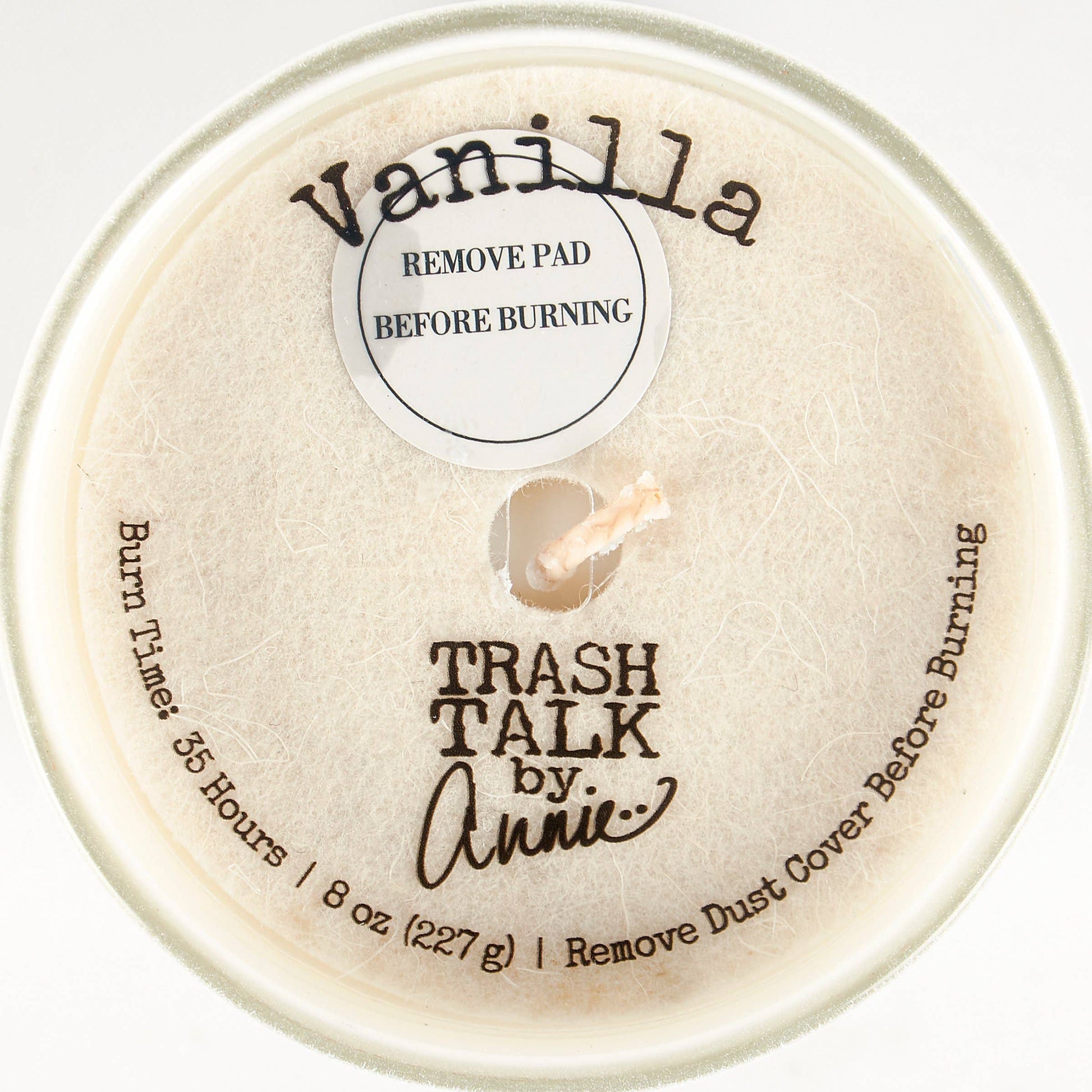 A candle from our Trash Talk By Annie Collection displaying a double-sided design of a vintage black and white photograph on frosted white glass complemented with a humorous sentiment that reads "May The Bridges I Burn Light The Way." Candle features soy-based wax and a cotton wick with 35 hours of burn time activating a soothing Vanilla scent. Our Light The Way candle includes a dust cover and plastic lid for protection and polished appearance. A hilarious home accent that is great for everyday gifting.