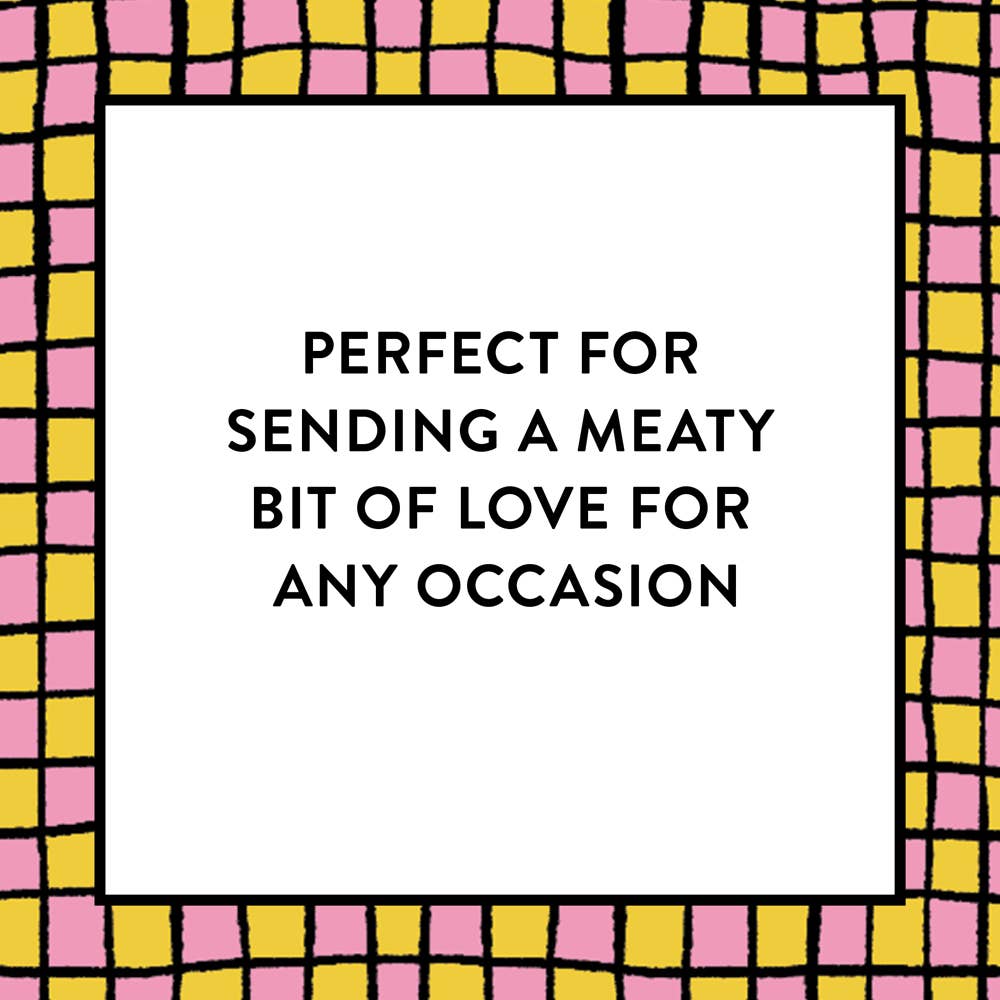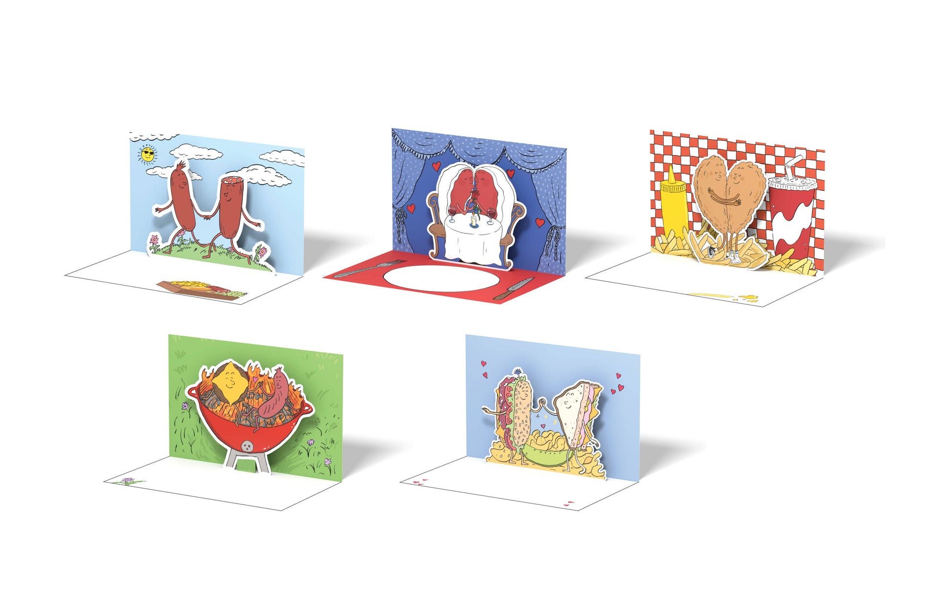 POP-UP NOTECARD SET: Send a tender message with these funny, protein-positive pop-up notes! Meaty treat pairs, including hot dogs, hoagies, chicken tenders, salami, and more, stand up to display in playful 3D.