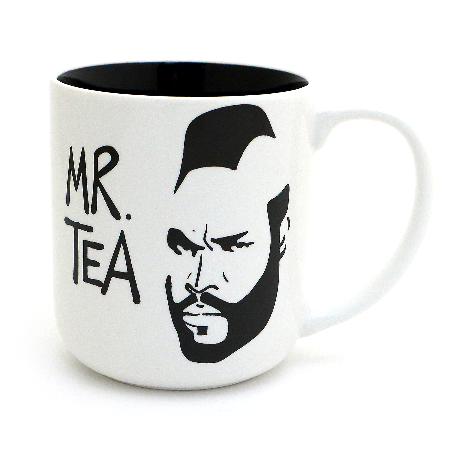 Mr. T Mr. Tea Mug in bone china with a black interior. This is a handmade tea mug featuring the image of my favorite A Team cast member: Mr. T! Because I pity the fool that doesn't love tea! This mug Read MR. TEA in bold letters on the front, and HAVE SOME TEA FOOL! on the back. It measures 4.5 x 3.5 and holds 16 oz. of your favorite chai. Each one of these is individually crafted. Slight differences are the sign of the handmade nature of this item.