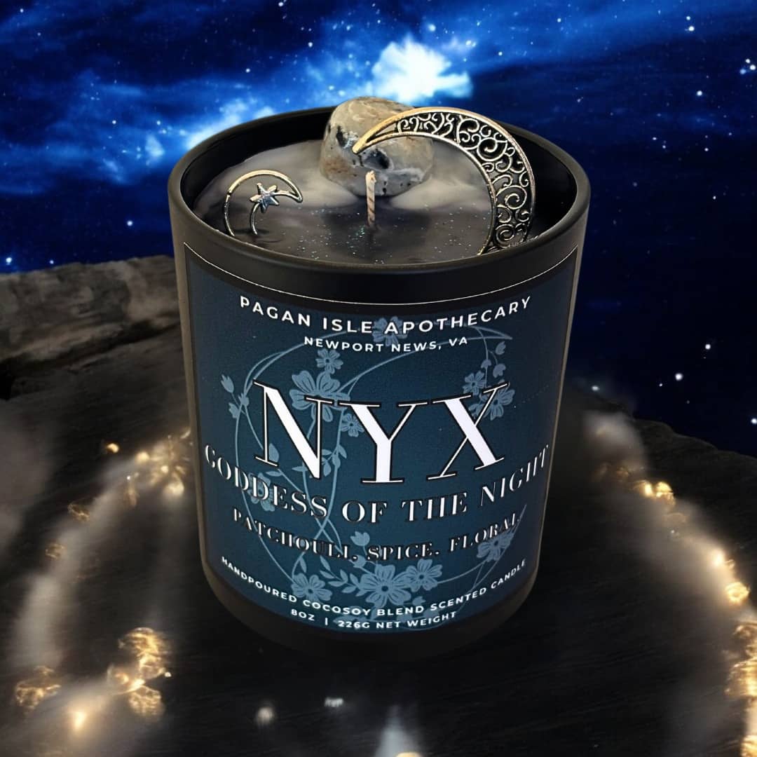 Invoke the enigmatic, all-encompassing energy of Nyx—the primordial goddess of the night, mystery, and cosmic power. This 10oz hand-poured candle, infused with the essence of the infinite void, awakens the senses and invites you to step into the shadows, where secrets and wisdom await.