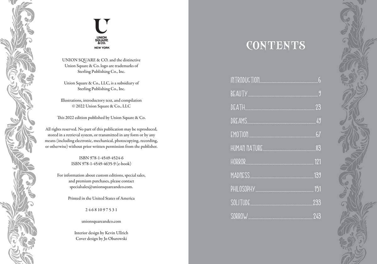 An illustrated wit-and-wisdom-style packaging of quotes and excerpts from the fiction and nonfiction of Edgar Allan Poe, organized by theme and presented in a lighter-than-Poe context. This book will collect several hundred quotes and aphorisms from Poe's poetry, fiction, and nonfiction. Quotes will be organized in thematic chapter groupings, and each chapter will be prefaced with several introductory paragraphs that discuss Poe's preoccupation with their subject matter in a lighter vein. Chapter subjects will include such themes as "Madness," "Dreams," "Revenge," "Mortality," and "Premature Burial." Spot illustrations will be distributed through the text. Hardcover Book with Printed Laminated Cover; 5 x 7 inches; 256 pages.