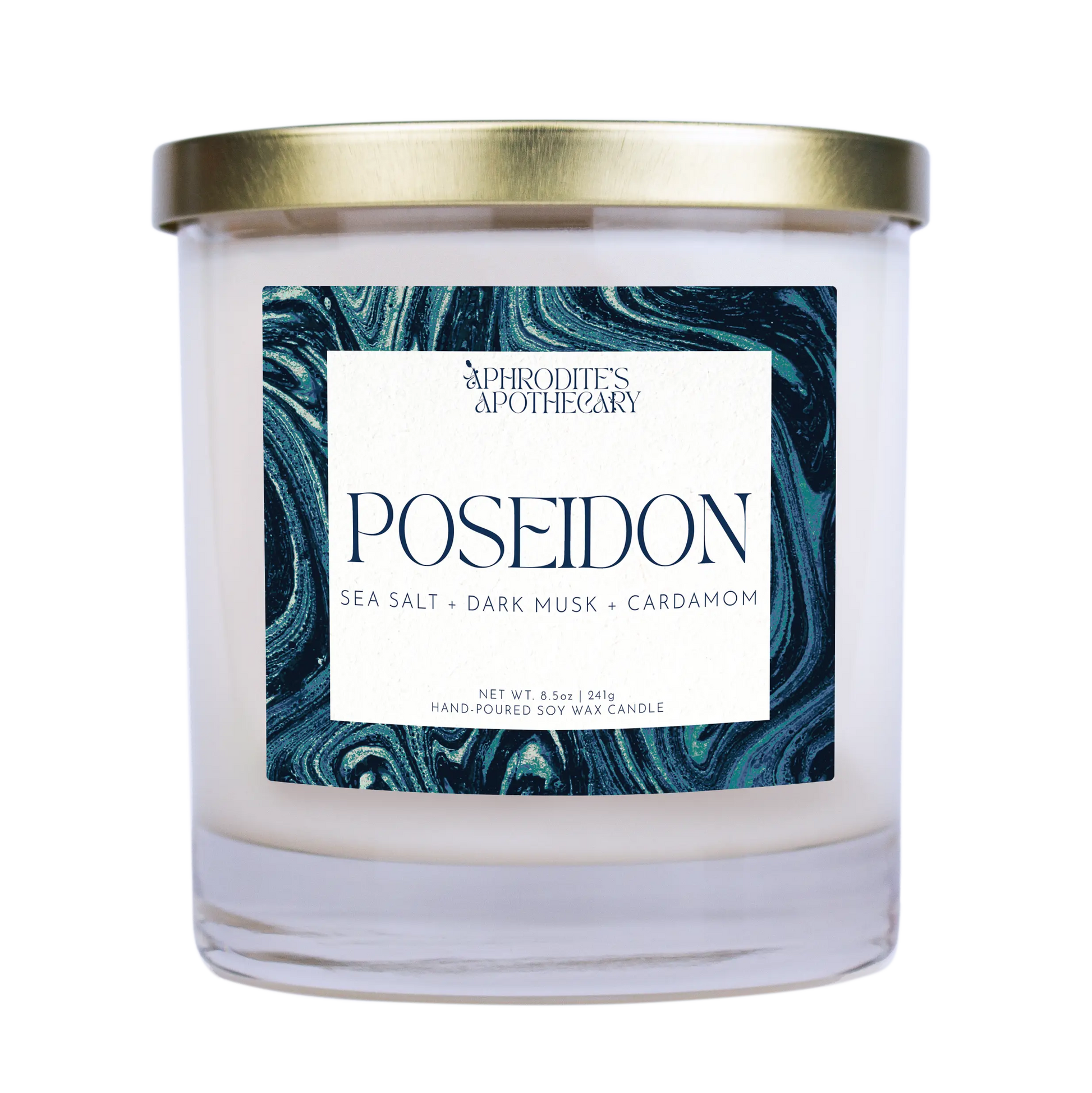 A sea-hardy scent, our Poseidon Candle captures the mysterious and powerful essence of the ocean. Sea salt, dark musk, eucalyptus, and cardamom create a complex and masculine fragrance that is both deep and aquatic. Channeling Poseidon, god of the sea, this scent will leave you feeling like you've just set sail on the briny waves of the Aegean.
