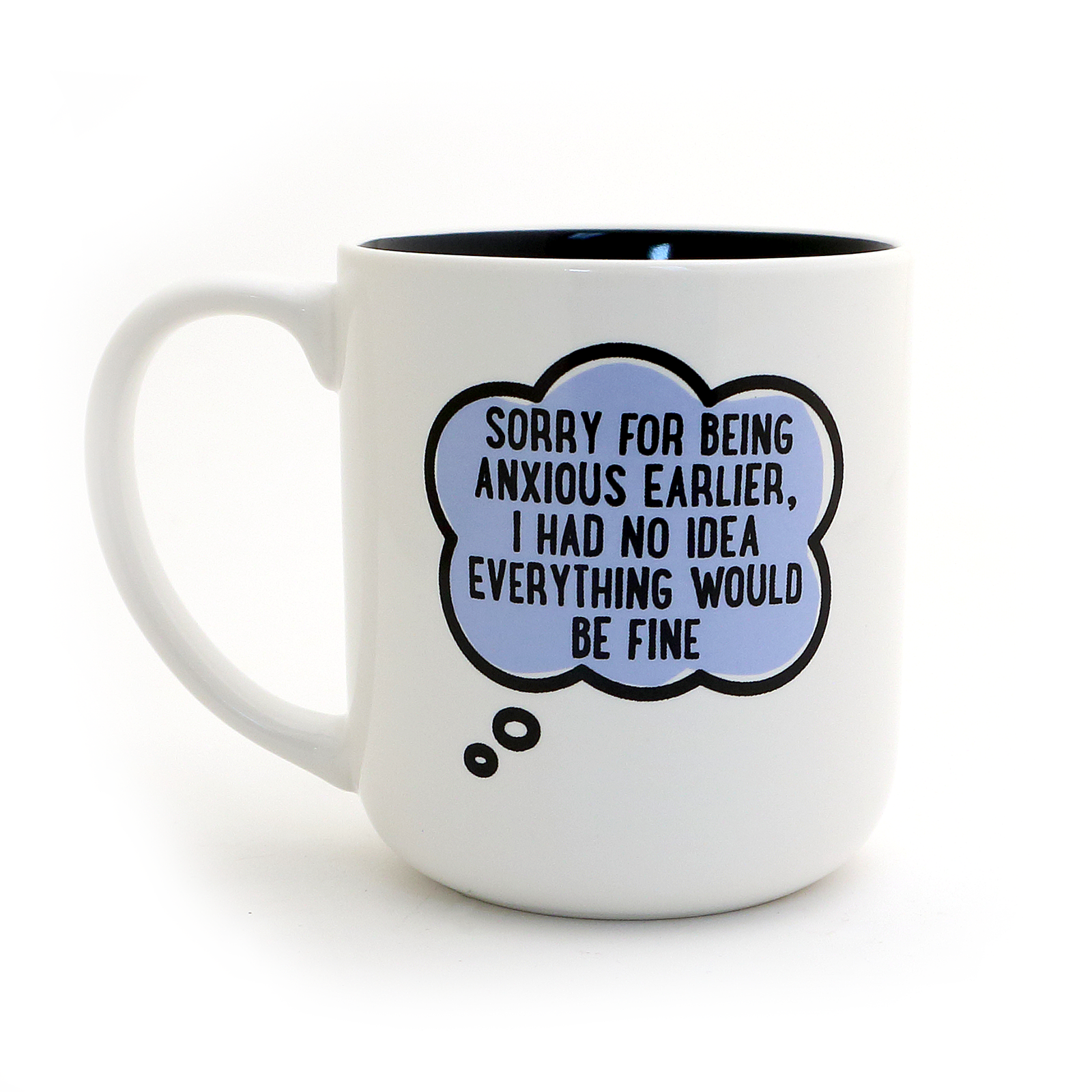 Professional Overthinker mug. Back Reads: Sorry for Being Anxious Earlier, I had no idea everything would be fine. Great mantra for today's times! This is a handmade ceramic mug created in our New Jersey studio. This is a stoneware mug measuring 4 x 4. Interior is black. Kiln fired, lead free glazes. Holds 16 oz. Dishwasher and microwave safe. Great gift for a co worker or friend who tends to overthink things and a reminder not to sweat the small stuff.