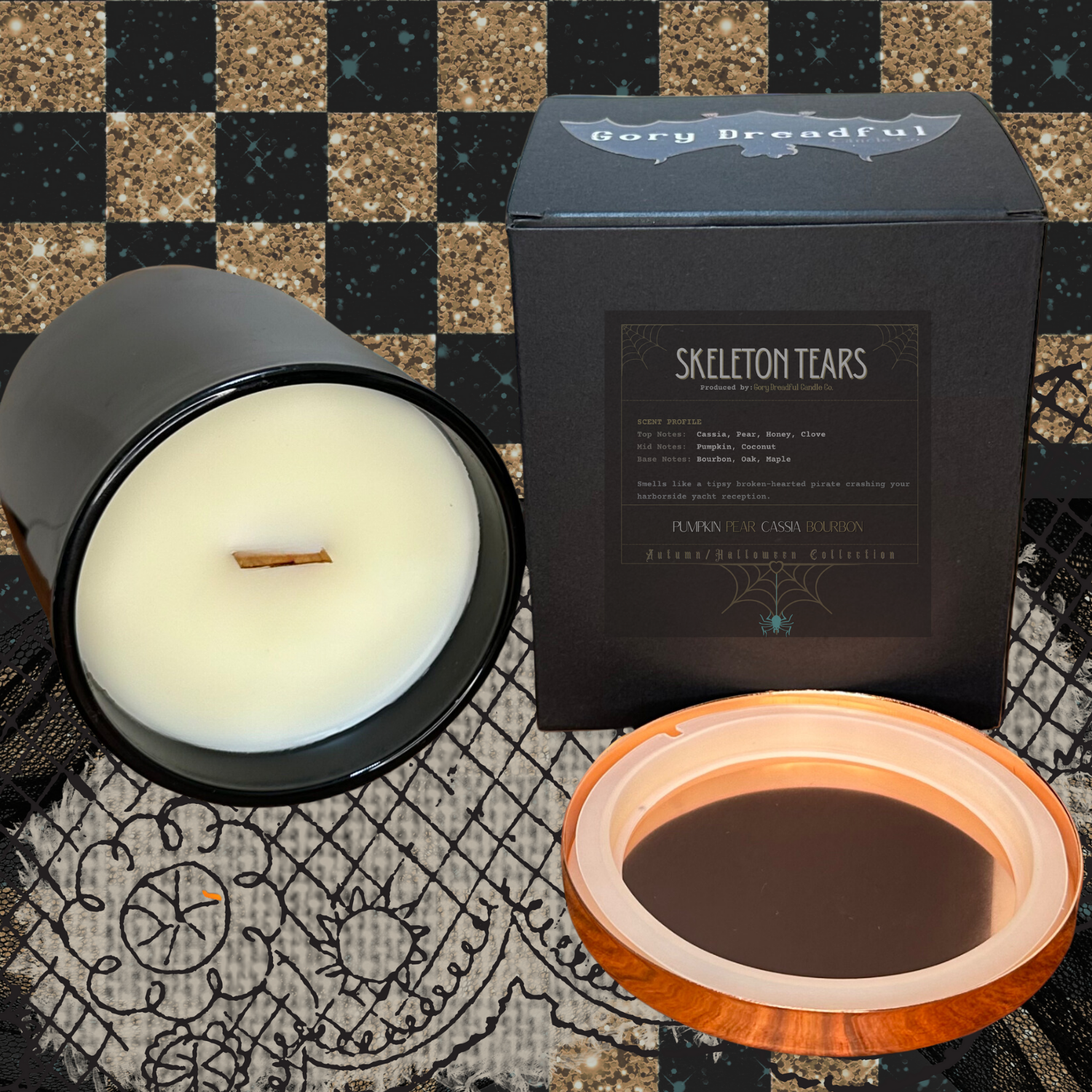 Skeleton Tears Crackling Wooden Wick Candle: Pumpkin Pear Cassia Bourbon Scent