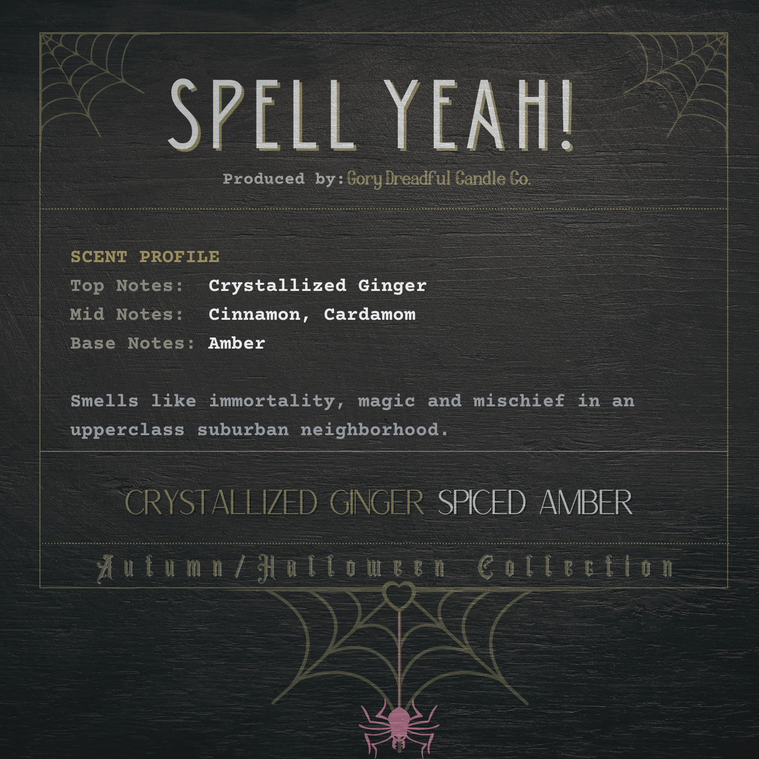 Spell Yeah is a fragrance that unleashes the power of the magic and mischief. This scent features a fiery and stimulating blend of crystallized ginger as the top note, creating a zingy and energizing aroma. The heart of the scent is a cozy and mysterious combination of cinnamon and cardamom, adding a touch of warmth and magic to this bewitching scent. The base note is amber, which adds a smooth long-lasting seductive aroma with an essence of immortality. Spell Yeah is inspired by watching too many reruns of "Bewitched" and daydreaming about 1164 Morning Glory Circle. It is the perfect fragrance for bringing out your inner Samantha Stephens.