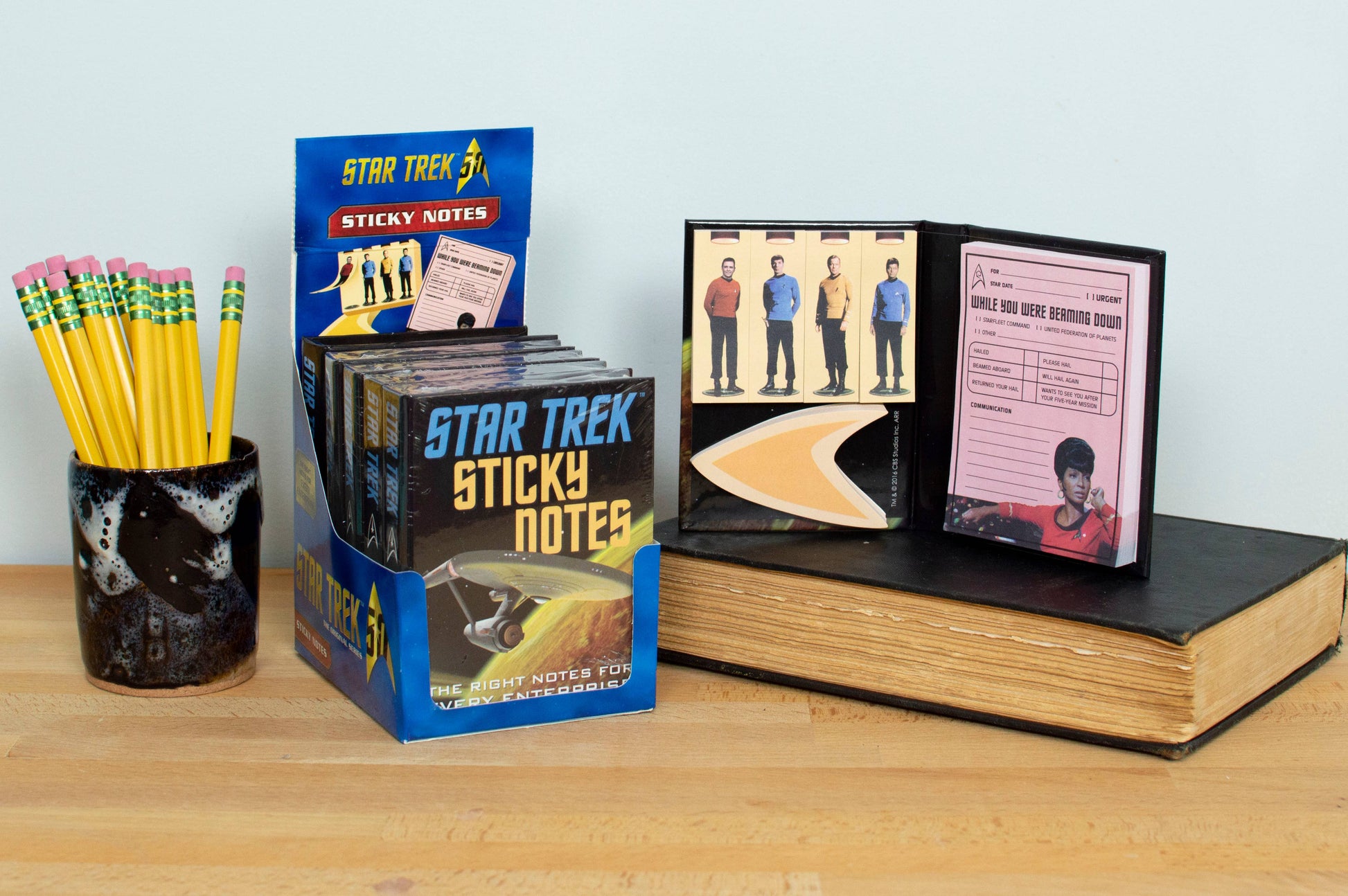 Lt. Uhura is in command of the message pad! Meanwhile, Kirk, Spock, McCoy, and Scotty appear -- and disappear -- as they beam up and beam down on the page markers! The Star Trek Sticky Notes booklet comes with hundreds of handy sticky notes featuring your favorite characters from the original series. Become your own chief of communications! Each 3 1/4" X 4 1/4"booklet contains over 300 sticky notes of assorted shapes and sizes. Timeless Keepsakes~ Trendy Kitsch~ We Have It All