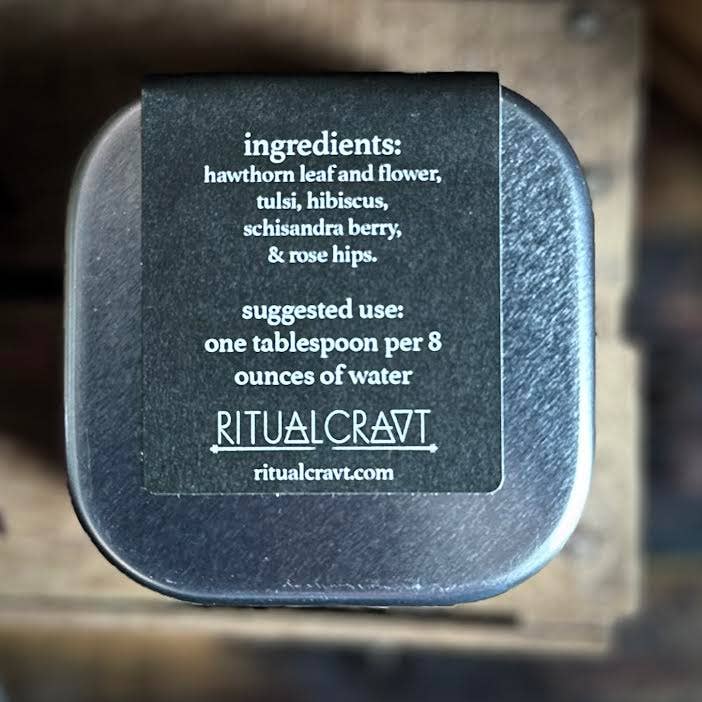 Ingredients: hawthorn leaf and flower, tulsi, hibiscus, schisandra berry, and rose hips.