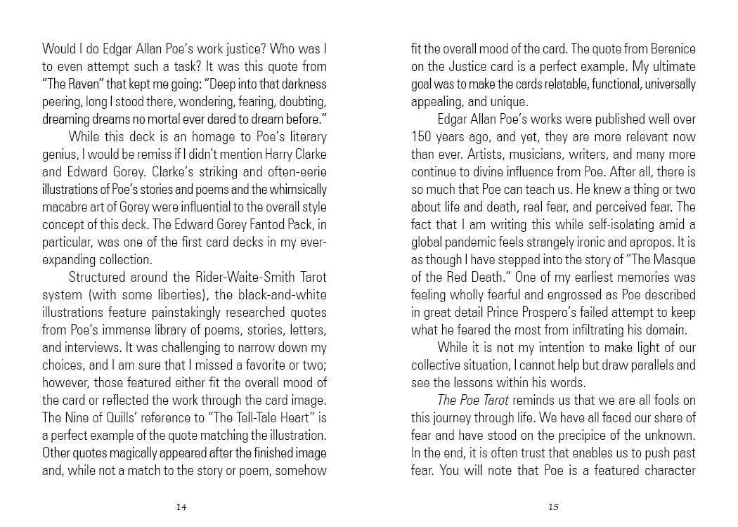 The Poe Tarot features the whimsical and, at times, macabre black-and-white illustrations by mixed-media artist/author Trisha Leigh Shufelt and quotes from the literary works and thoughts of Edgar Allan Poe.