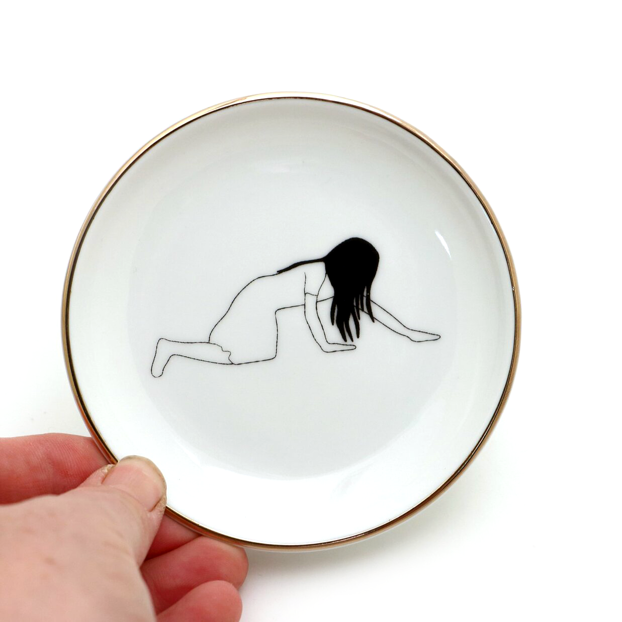 Horror fans will love this tribute to THE RING. This ring dish features our favorite gal and has a 22K gold rim. This small round dish is the perfect place to keep rings or other trinkets while busy working, or trying to get other people to watch a certain videotape. Great Halloween gift. Created from porcelain clay and kiln fired numerous times. This small dish measures 4 x 4.
