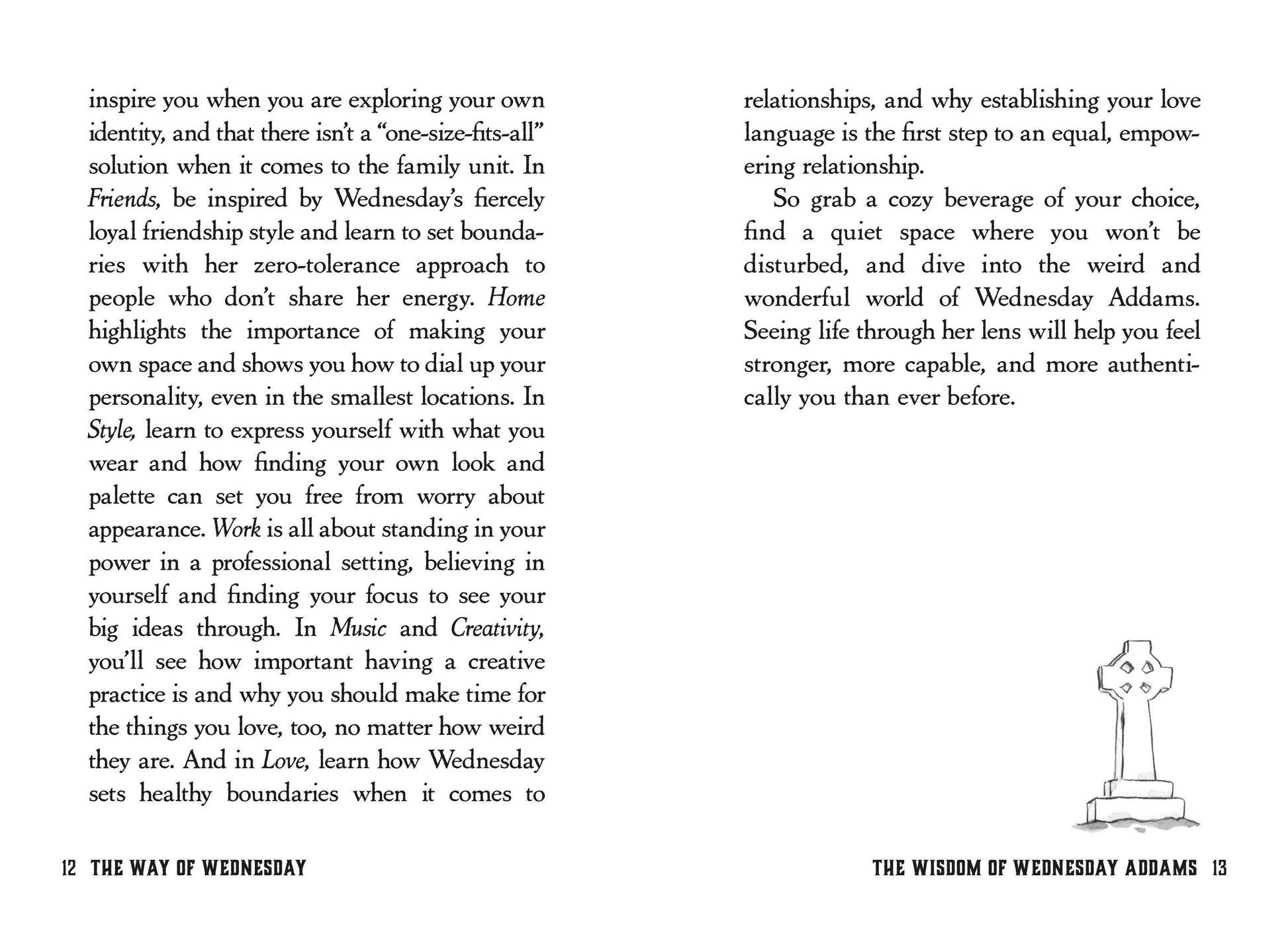 A poppy illustrated gift book featuring Wednesday Addams's take on family, friends, music, style, and love. In media both new (Netflix's runaway hit Wednesday starring Jenna Ortega) and old (Christina Ricci's star-making turn in the Addams Family movies), Charles Addams's Wednesday character is a hilariously morbid female-forward icon for all ages and generations. This laugh-out-loud illustrated guidebook presents Wednesday's unofficial guide to life—filled with snippets, sidebars, and scenarios sure to bring forth the latent goth in everyone. Hardcover Book with Printed Laminated Cover; 4 5/8 X 6 9/16 inches; 128 pages.
