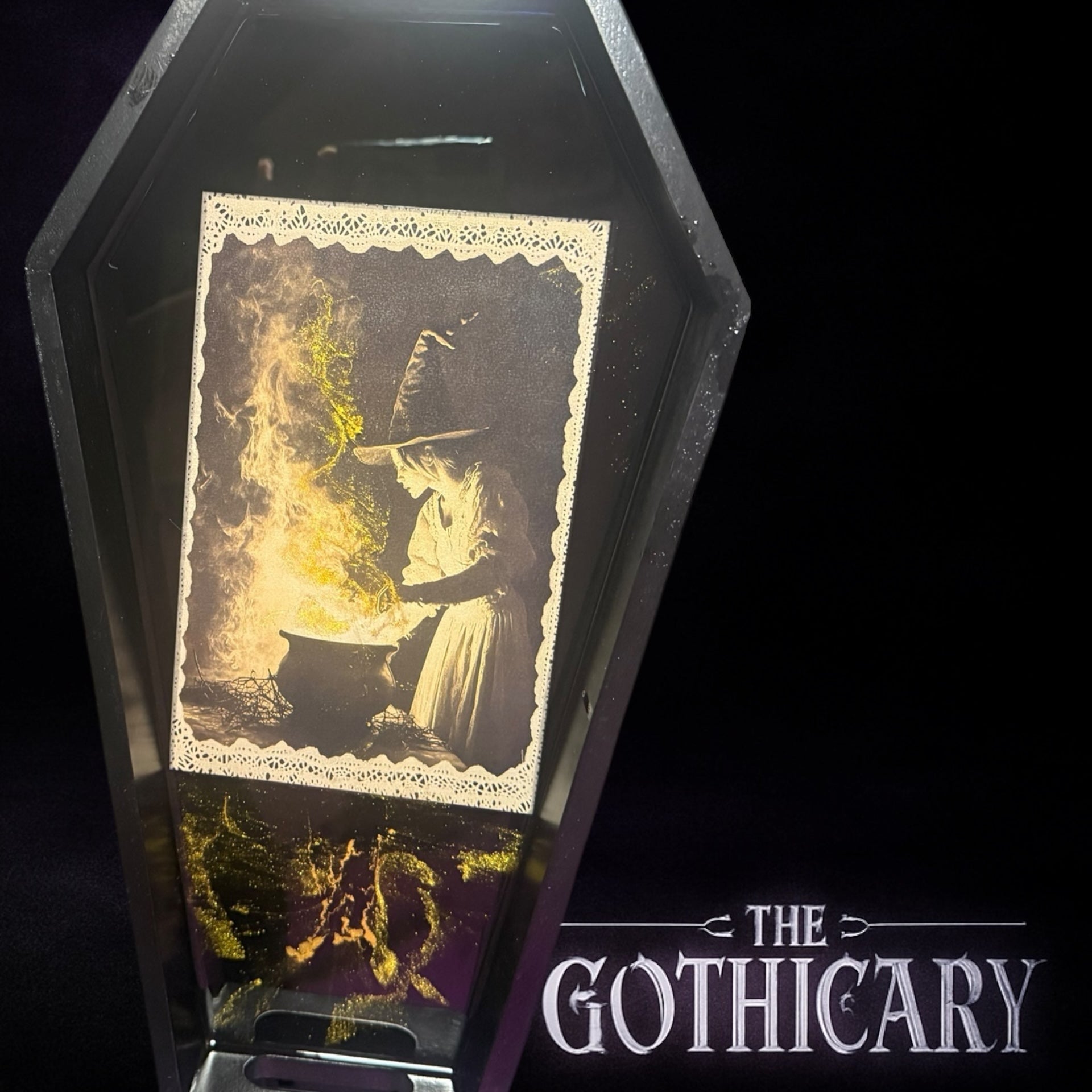 A haunting homage to feminine power, this resin coffin tray captures a young witch mid-spell, flames dancing as she stirs her own destiny. Embedded with gold shimmer and gothic lace edging, it’s a reminder that magic starts at your fingertips.