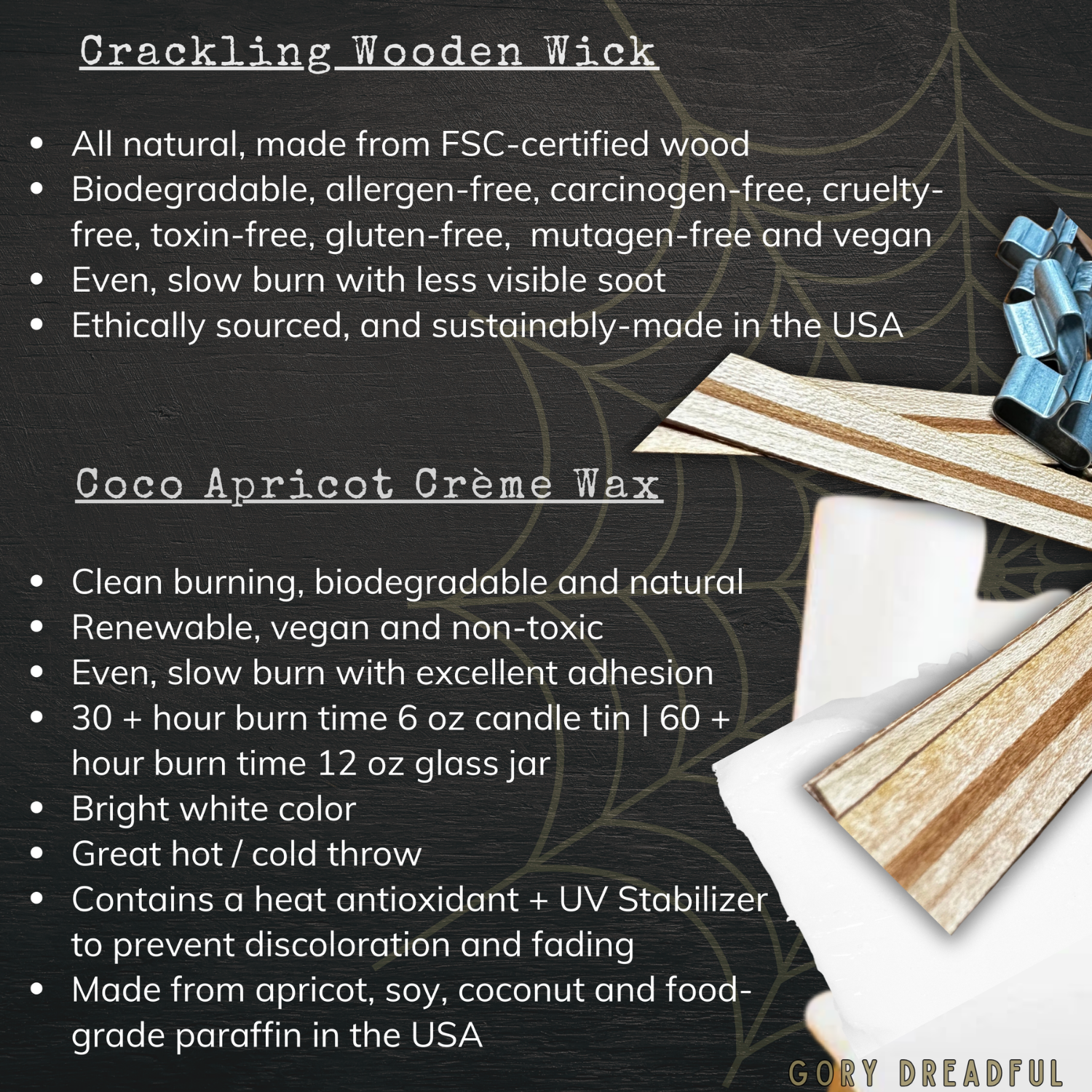 Featuring a FSC-certified clean burning wooden crackling wick in a smoky black glass jar with a metallic copper lid. Holographic label and holographic bat monogram create a cool aesthetic that catches and play