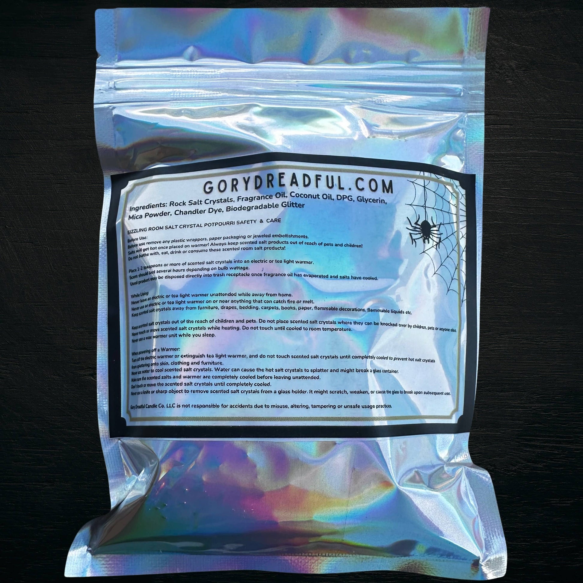 Packed in a resealable holographic bag to pour directly into warmer dish. Silver Metallic organza bag and bamboo scoop included for use as potpourri.