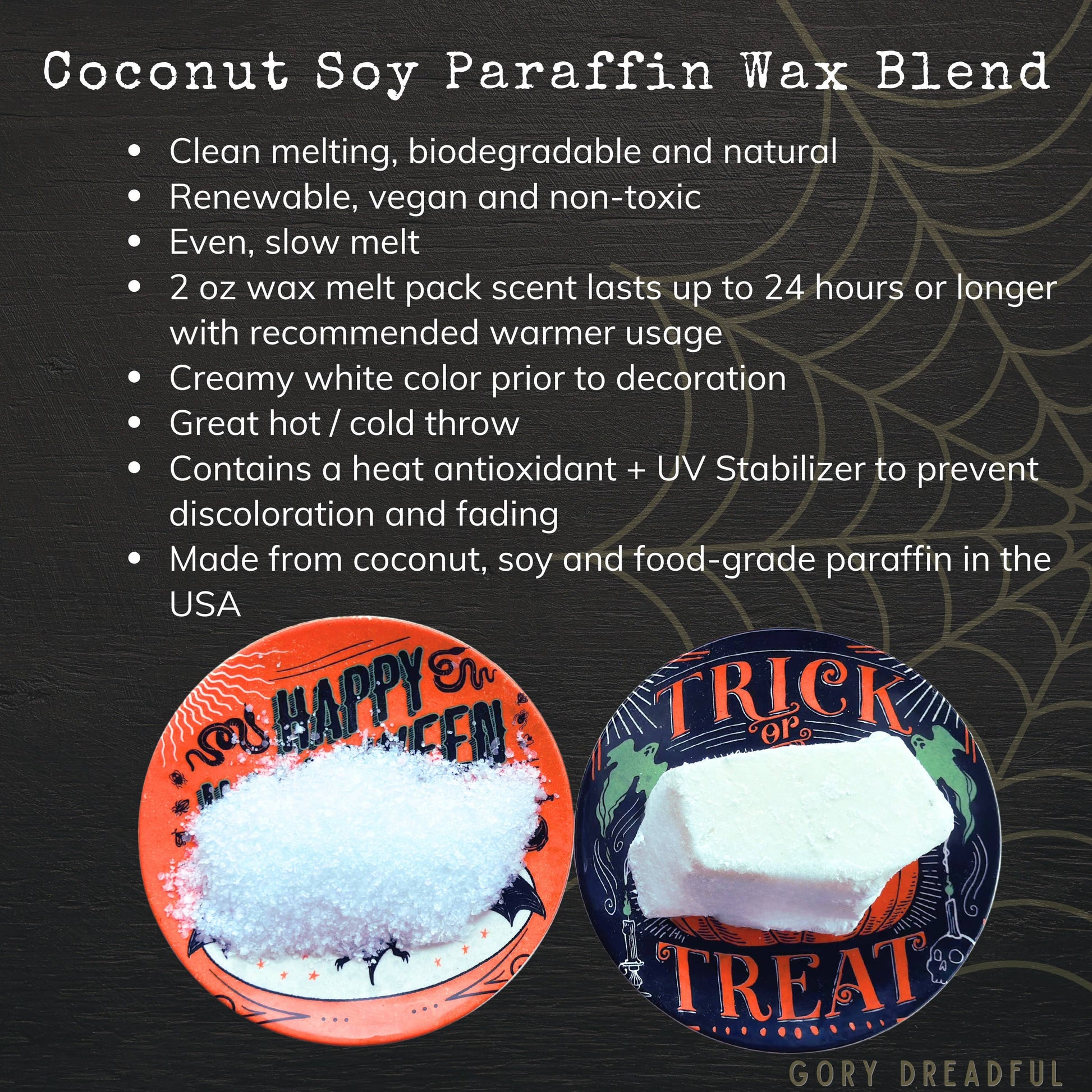 Hand-poured creamy luxury Coconut and Soy blended with Paraffin results in an amazing, long-lasting hot throw of scent throughout the entire room. A touch of color, mica and biodegradable glitter adds a fun sparkling visual effect to your melting experience.